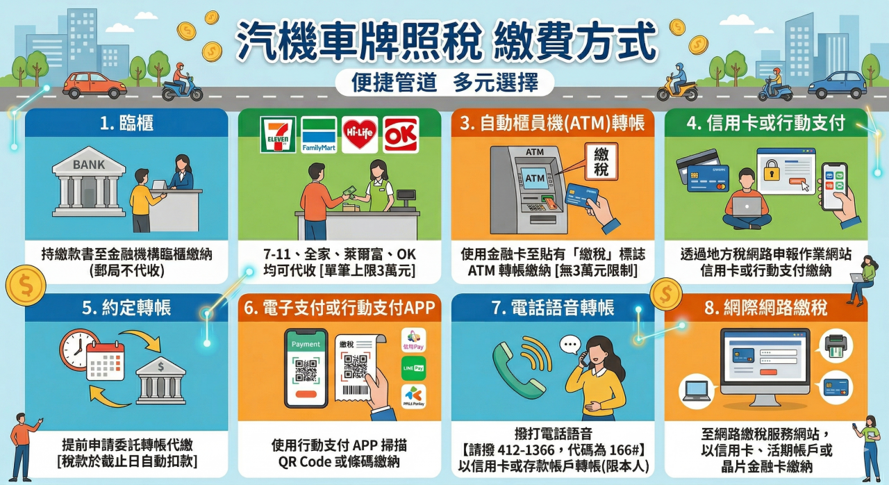 2026汽機車使用牌照稅繳納期限自4月1日起至4月30日,汽機車牌照稅繳納方式,除了超商直接繳款、線上繳稅,ATM、信用卡、晶片金融卡、行動支付都能繳納牌照稅。
