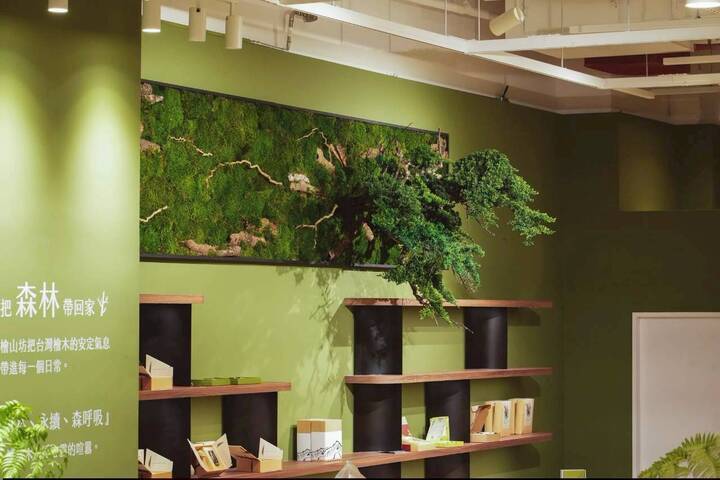 台南旗艦店以森林綠、自然木色與石材為主調,巧妙融入「花磚」語彙與懷舊物件,循香而去,映入眼簾的是鋪著真實泥土、青苔的長桌,與安靜生長的真柏、筆筒樹及蕨類;在這裡,植物才是主體,架上產品僅是點綴,將主角位置還給自然,正是品牌對萬物最深的敬意。這份款待的心,也體現在入店奉茶的細節裡,選用台南傳承六代的百年中藥行「博仁堂」的漢方養生茶,溫潤茶湯伴隨檜木香,讓山林靜謐與府城人情溫暖交會。