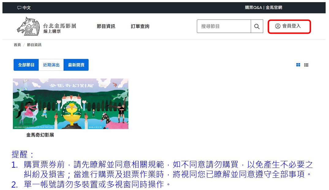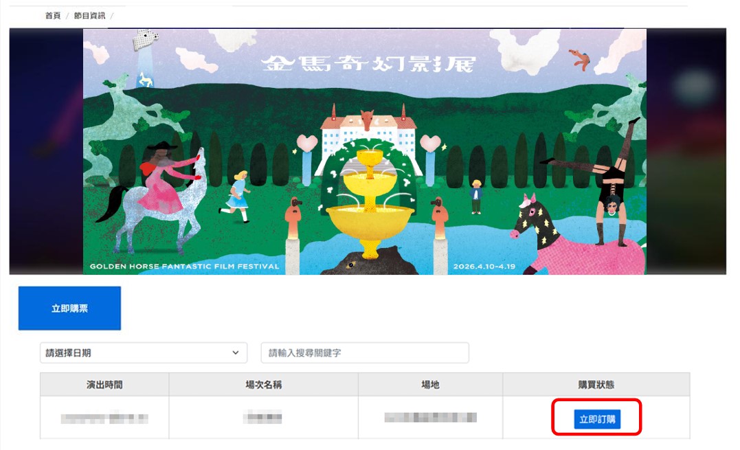 選擇【金馬奇幻影展】、點選【立即購票】,選擇場次,再點選【立即訂購】