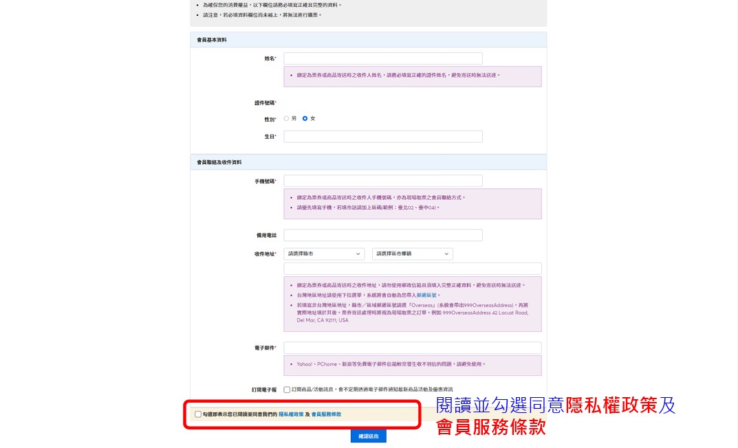 填寫購票網會員資料,點選【確認送出】(僅第一次使用購票網之會員須填寫)