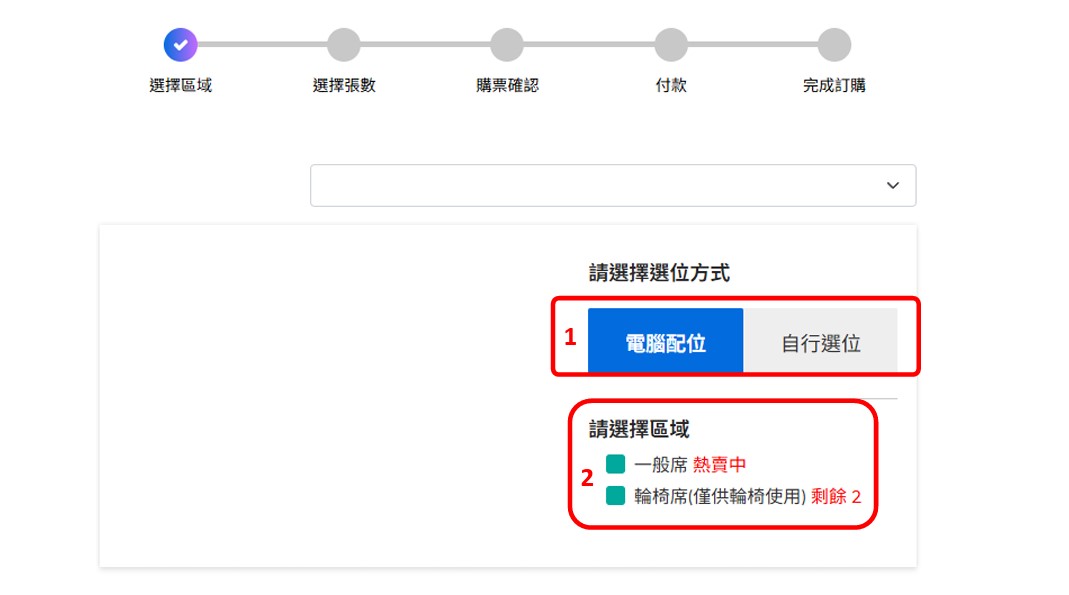 先選擇【電腦配位】或【自行選位】再點選區域【一般席】或【輪椅席】進到下一步(需要陪同席者,請持票券與身心障礙證明至影展現場售票處加購)