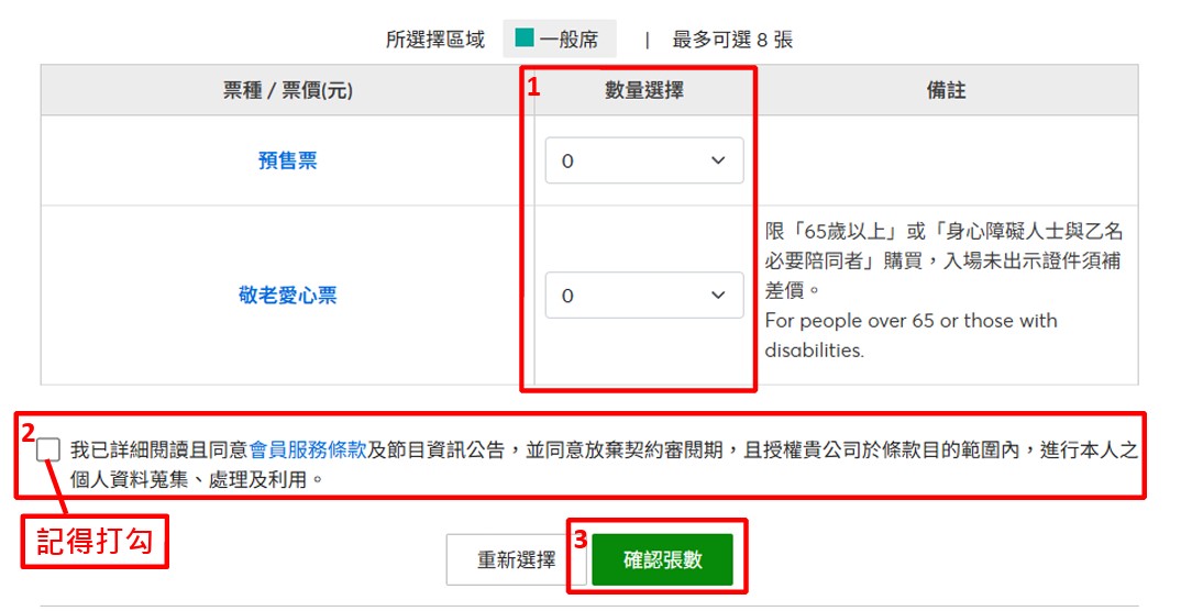 電腦配位:選擇票種張數、閱讀並勾選同意條款