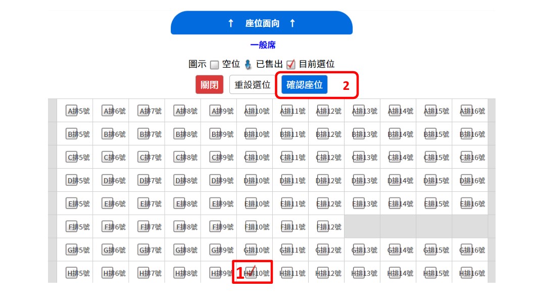 自行選位:先勾選座位,再點選【確認座位】→ 選擇票種張數、閱讀並勾選同意條款