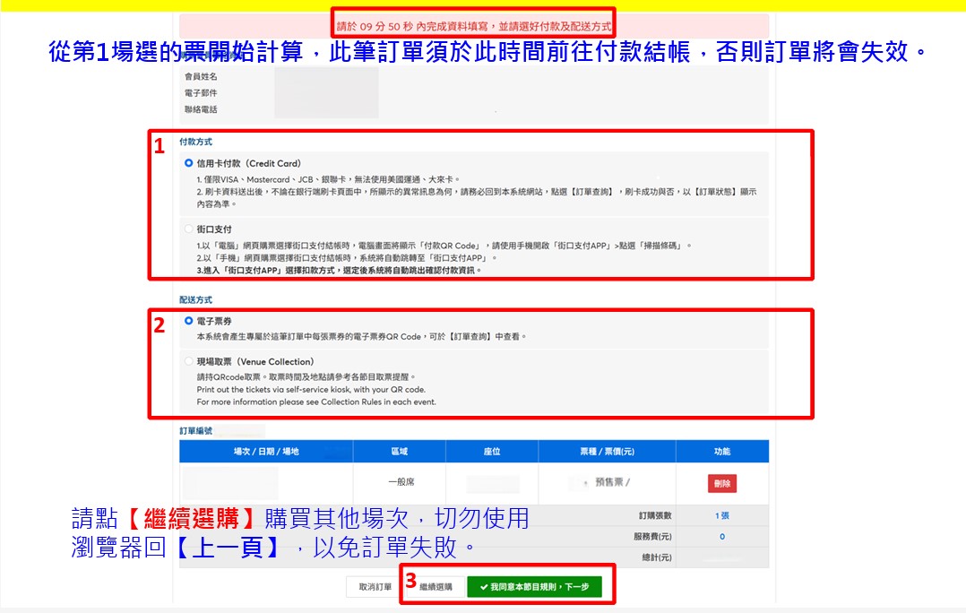 選擇付款方式、取票方式,確認明細,點選【下一步】前往付款或【繼續選購】