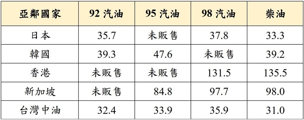 台灣中油指出,政府綜合考量亞鄰國家油價漲幅及其政府補貼等因素,3月30日至4月5日亞鄰最低價原則再擴大增加汽、柴油吸收金額,分別增加為4.1元及7.0元。