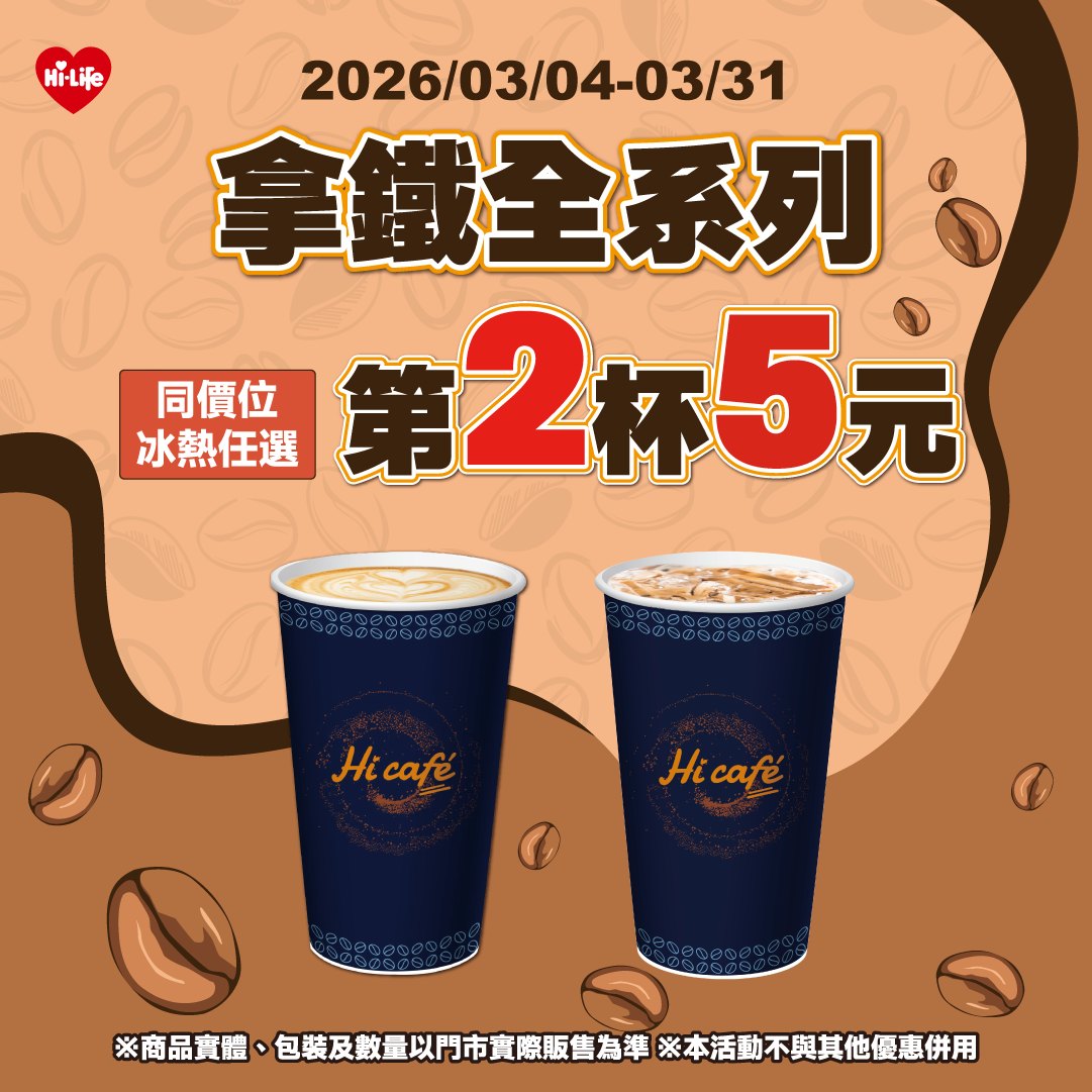 - 拿鐵全系列同價位冰熱任選第2杯只要5元
