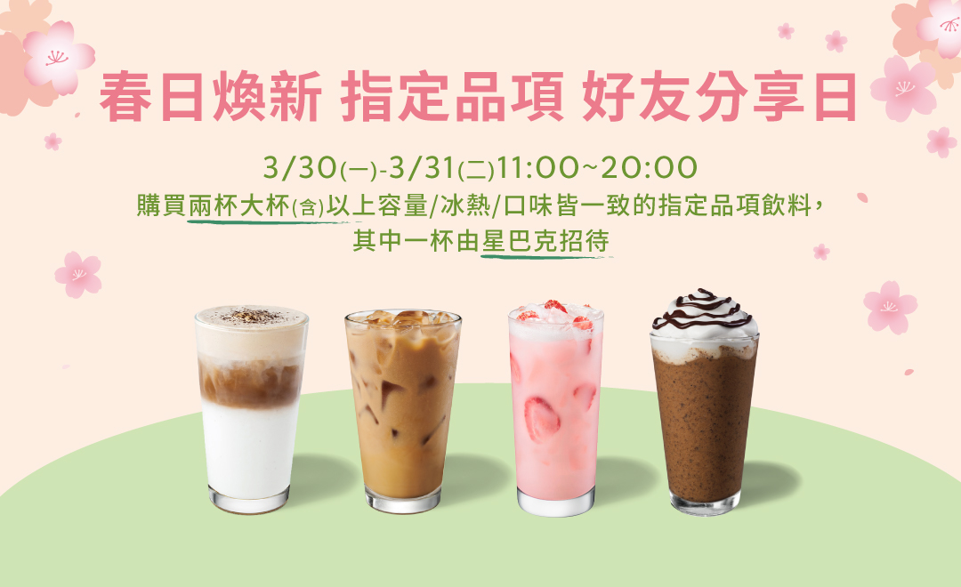 星巴克買一送一活動又來了,根據星巴克官網,在3/30 (星期一)至3/31(星期二)連續兩天推出「春日煥新 指定品項 好友分享日」咖啡買一送一優惠活動,於活動期間11時至20時,至門市購買兩杯大杯(含)以上容量/冰熱/口味皆一致的指定飲料,其中一杯由星巴克招待。