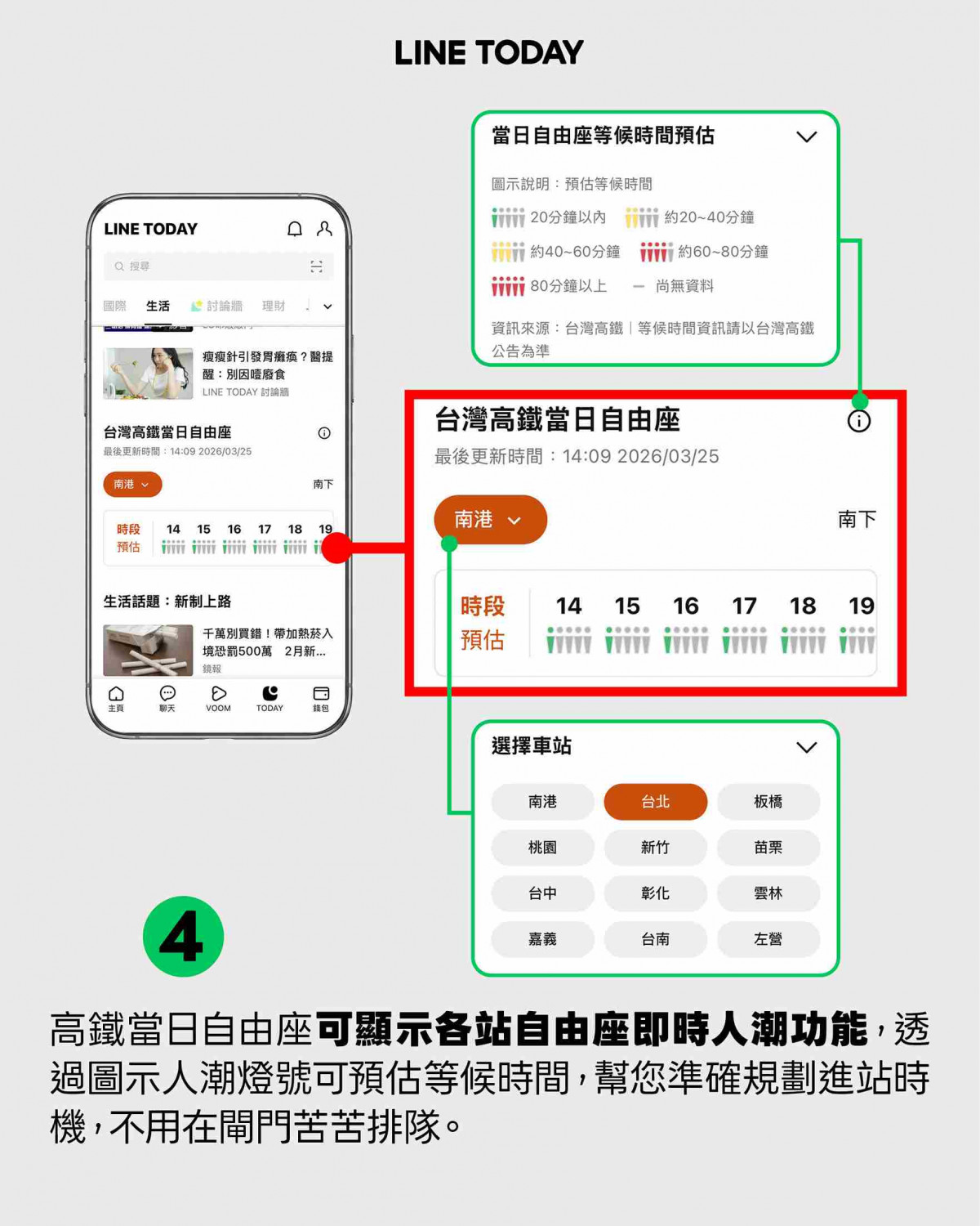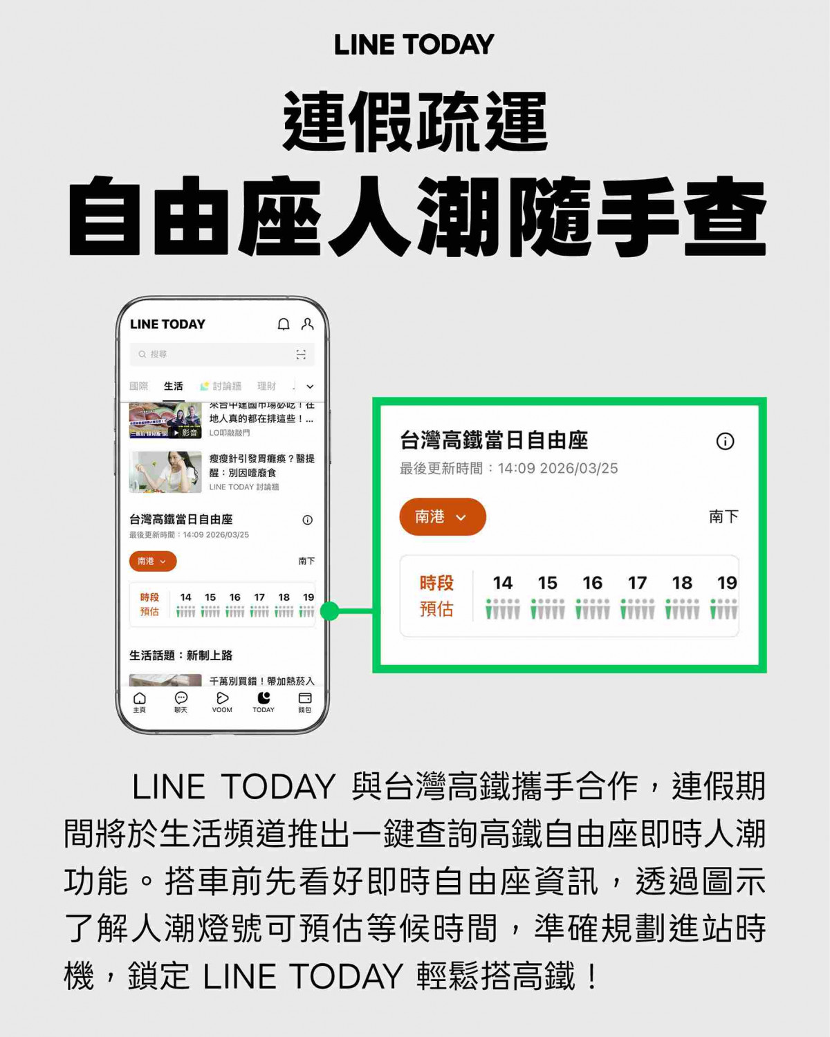 目前LINE TODAY「生活頻道」已經上線全新「自由座等候時間預估」服務,將整合台灣高鐵官方數據,每30分鐘更新一次預估等候時間,呈現資訊與高鐵企業網站一致。