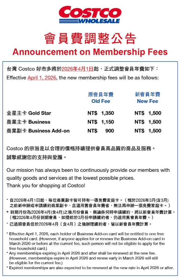 台灣好市多Costco會員費要調漲了,這是自2016年以來首次調整,好市多日前發布公告,自4月1日起,金星會員由1350元調整為1500元,相當於每月增加不到13元;商業會員由1150元調整為1500 元,商業副卡則是一口氣貴600元,由900元調整為1500元。
