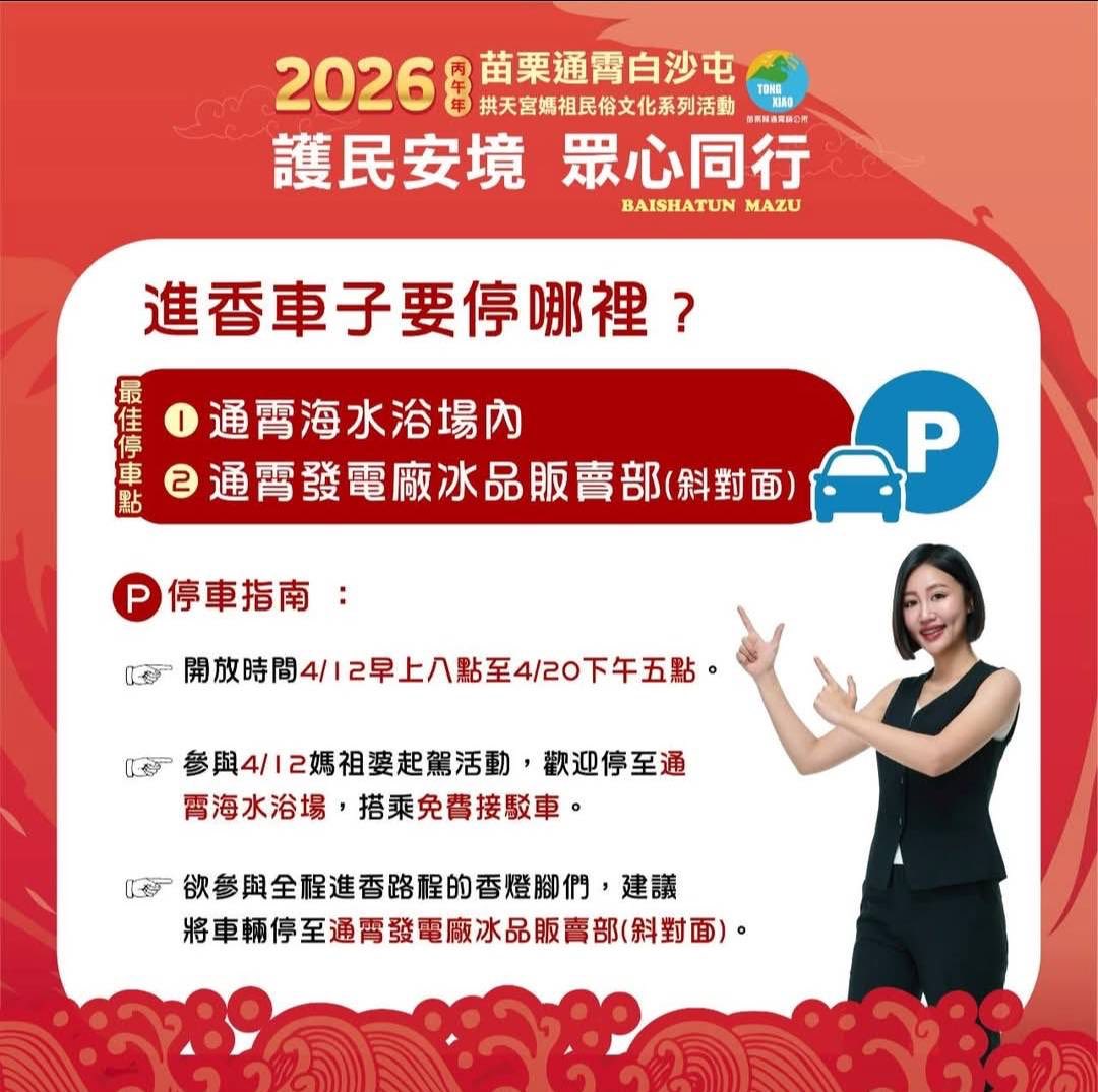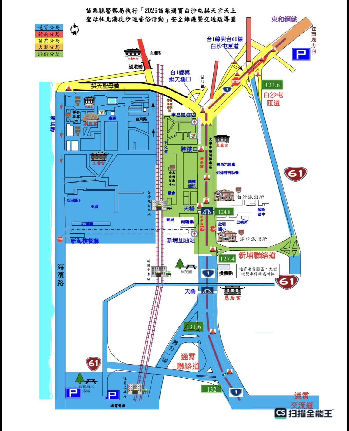 通霄警方表示,媽祖起駕期間將實施大規模交通管制,台1線預計於12日上午8時至13日上午8時全面封路,封閉範圍為台1線123.5公里(台61線白沙屯匝道路口)至127.4公里(台61線新埔聯絡道路口),南北雙向車道全線禁止通行。
