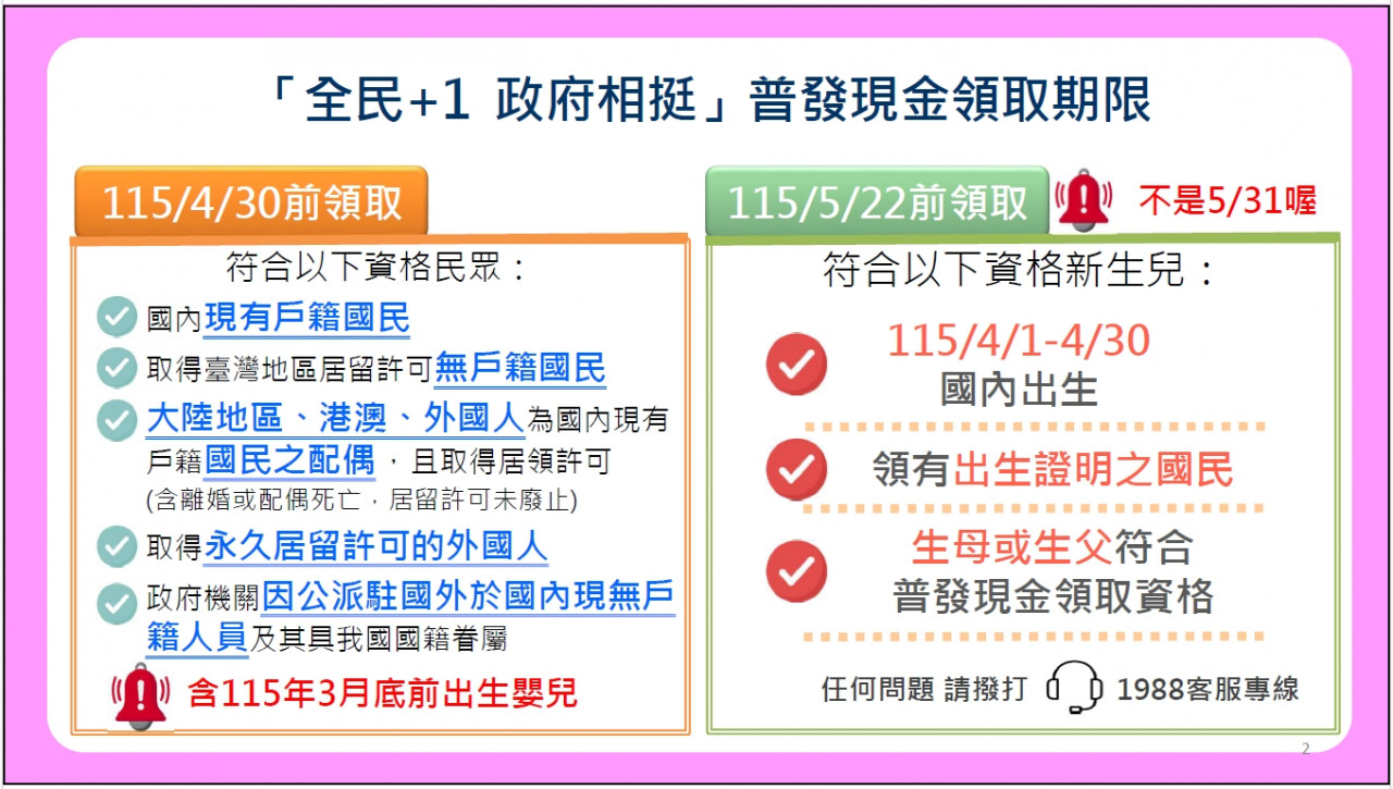財政部國庫署呼籲,符合領取資格且尚未領取的民眾,請把握時間,儘速選擇適合的方式領取。近期剛恢復戶籍之國人或取得居留許可之外籍人士,如於領取過程中遇有任何疑問,請務必於4月30日前撥打1988免付費客服專線洽詢,將有專人提供協助。