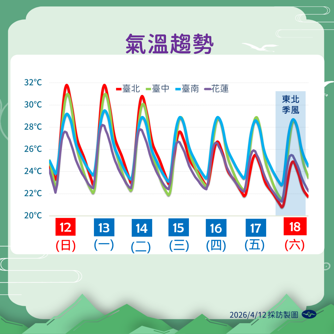 4/15~4/18 低溫預測:中部以北及宜花20~23度,南部及臺東22~24度,澎湖23~24度,金門19~21度,馬祖18度;高溫預測:北部及東半部25~28度,中南部29~32度,澎湖27度,金門24~25度,馬祖21~22度。