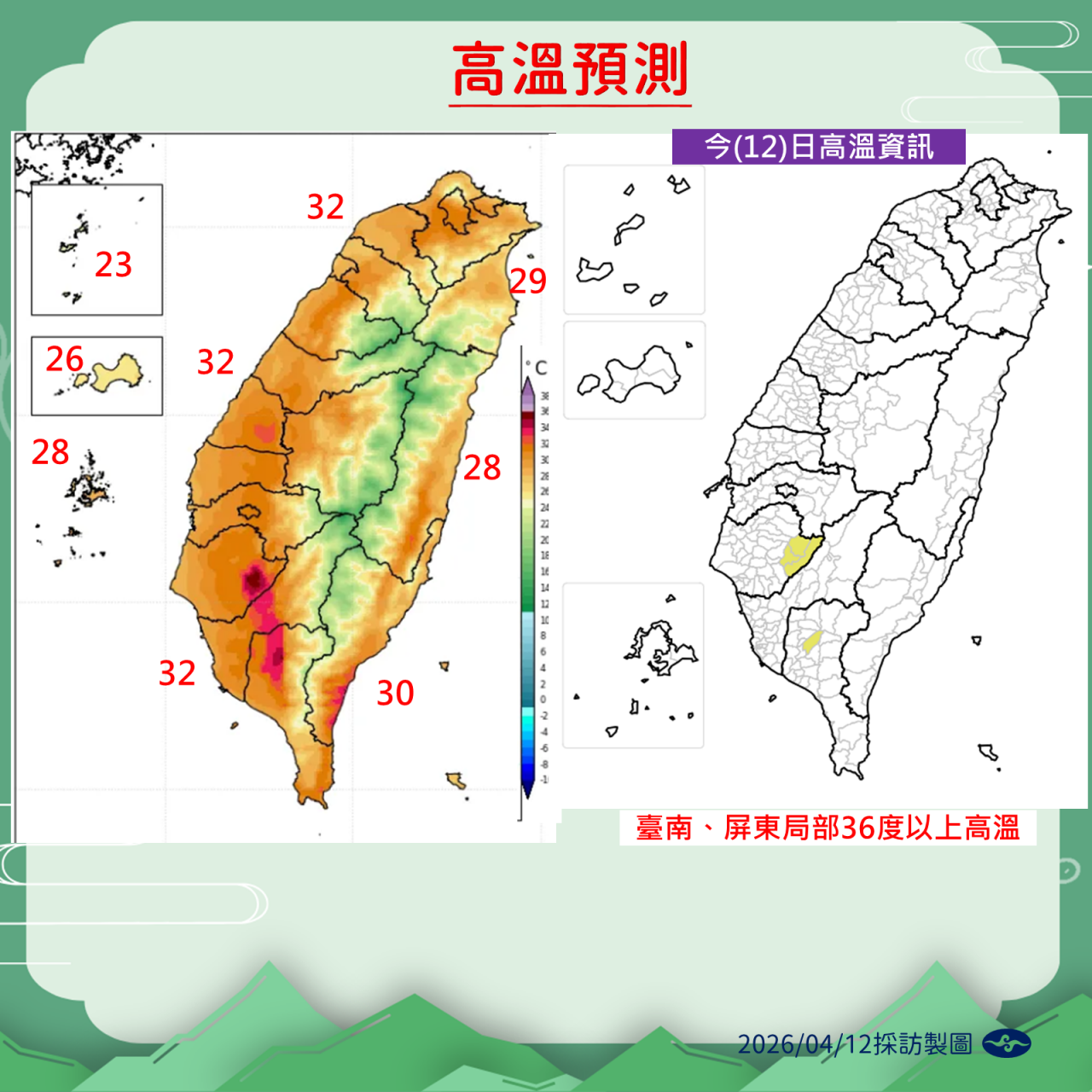 4/13~4/14 低溫預測:臺灣各地21~24度,澎湖24度,金門21度,馬祖18~20度;高溫預測:臺灣各地28~32度,澎湖28度,金門26度,馬祖22~24度。