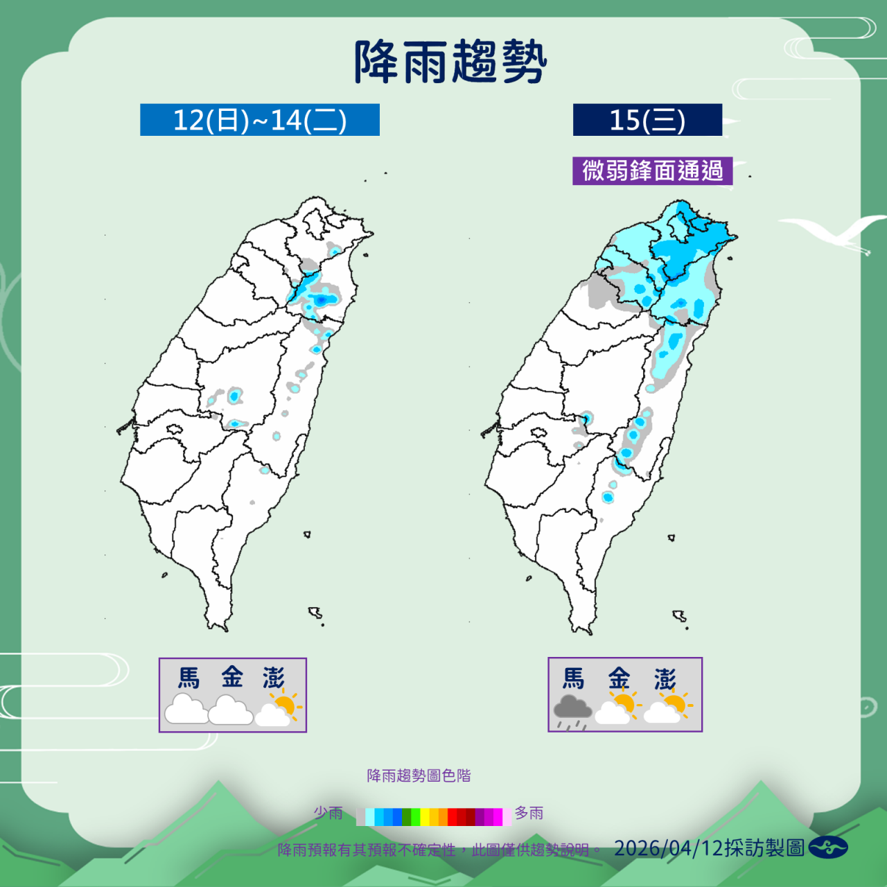 周三(4/15)有一道微弱鋒面通過,桃園以北、東北部及東半部有局部短暫陣雨,竹苗及台東有零星降雨,其他地區為多雲到晴,午後中南部山區有零星短暫陣雨。周四(4/16)鋒面離開,風向轉為偏東風,基隆北海岸及東北部有局部短暫陣雨,其餘地區多雲到晴,午後山區有零星短暫陣雨。