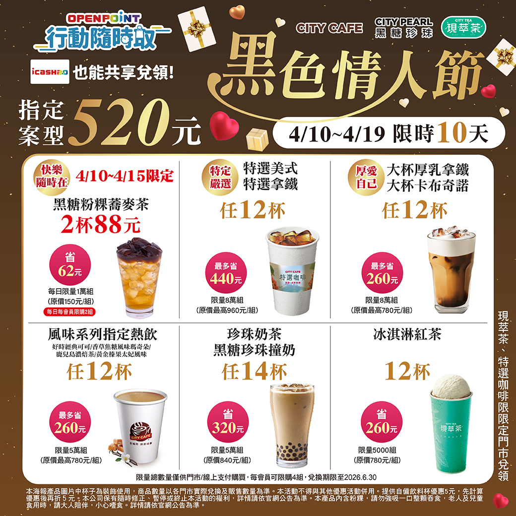 - 大杯厚乳拿鐵、大杯卡布奇諾12杯520元