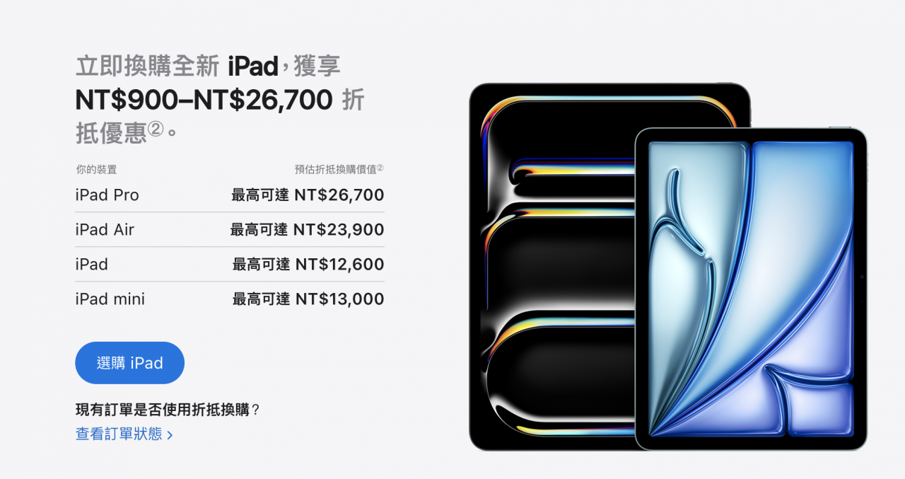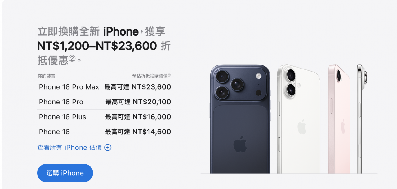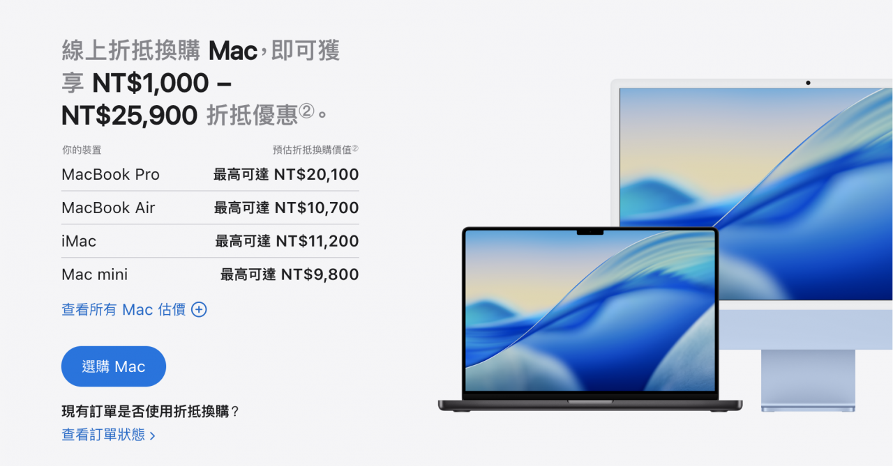 除了限時活動外,Apple一直也推行「Trade In換購方案」,即為「舊機折抵換新機」,Apple用戶可以把原本的舊機(iPhone、iPad、Mac、Apple Watch 等),交由蘋果官方估價,並拿來折抵你要買的新產品,或以等值價格換成 Apple Store 禮品卡,供日後隨時用於選購 Apple產品。