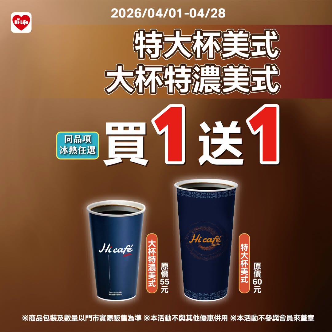 - 大杯特濃美式買1送1(原價55元、特價28元)