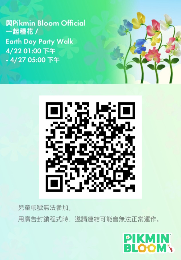 為了響應世界地球日,《Pikmin Bloom》從台灣時間4月22日12:00至4月27日16:00,透過指定連結或掃描 QR Code,加入官方「Party Walk」。