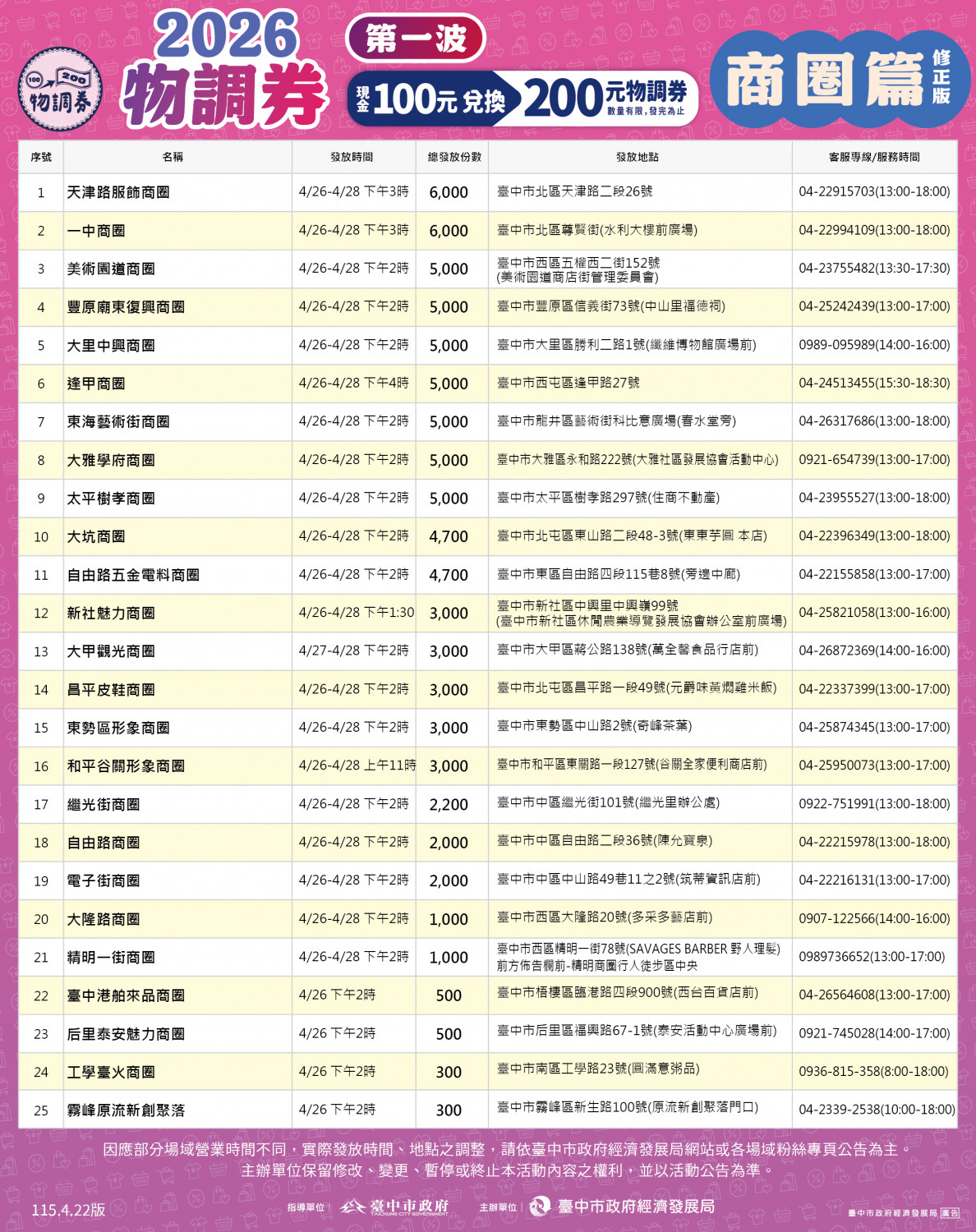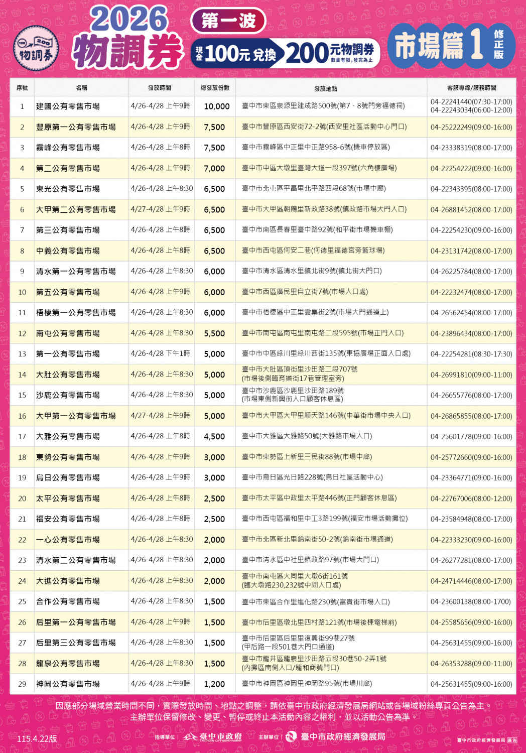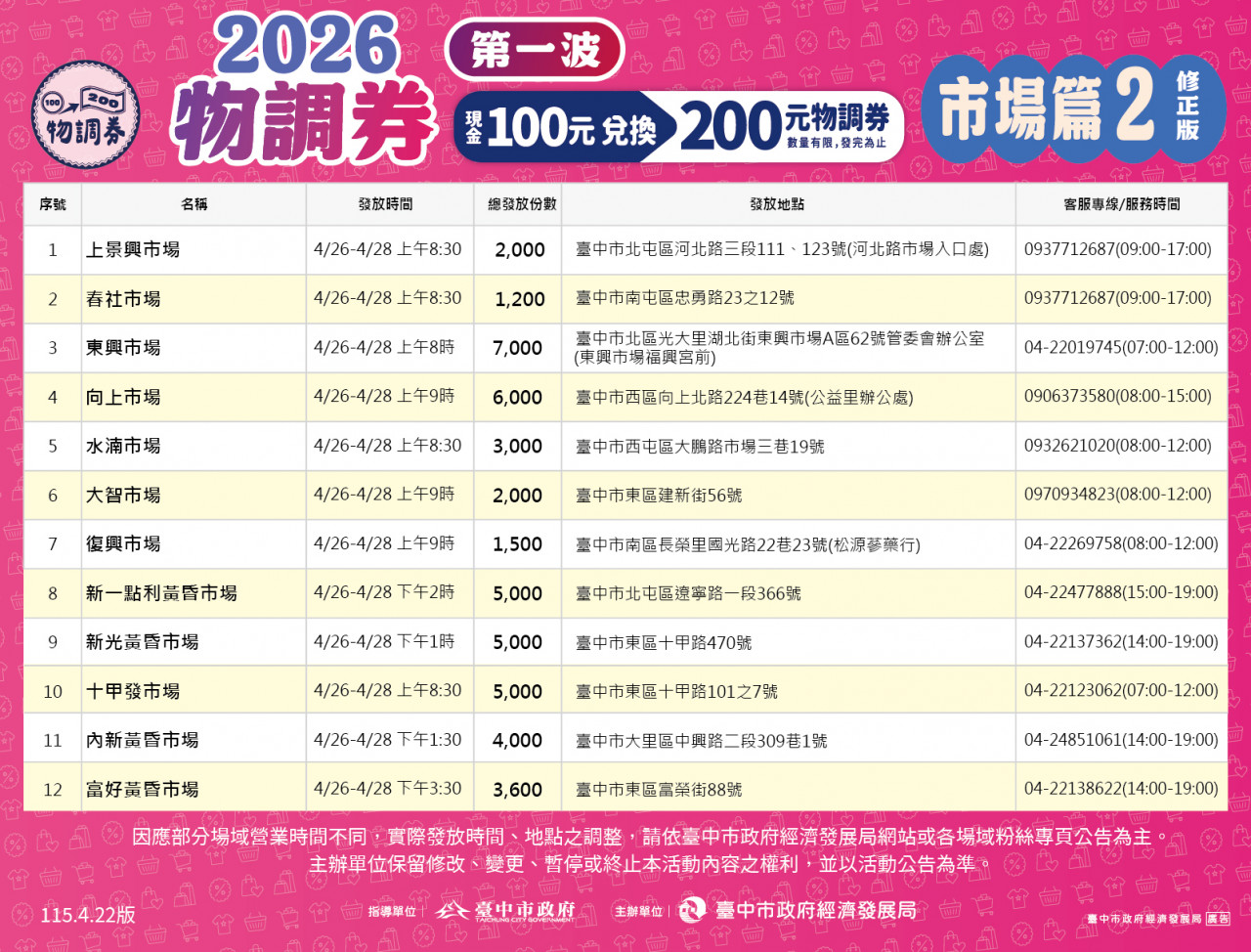 因應大甲地區宗教活動,大甲第一市場、大甲第二市場、大甲蔣公路觀光夜市及大甲觀光商圈等處,調整於 4/26 至 4/28 進行發放。