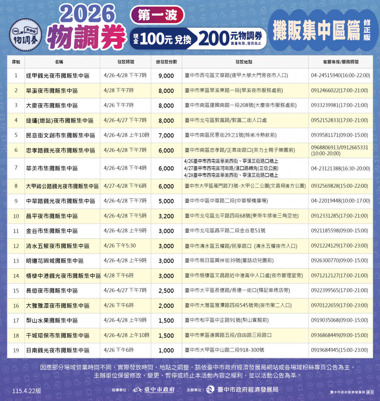 本次活動規模龐大,發放地點涵蓋台中市各大傳統市場、商圈及特色景點。包含以下