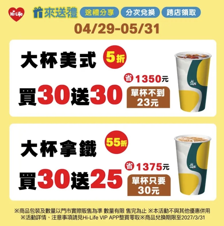 - 大杯拿鐵買30送25,5.5折(原價55元、特價30元)