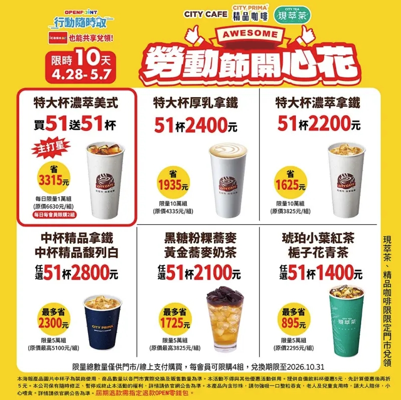 5/1勞動節連假優惠來了!業者們紛紛祭出各式優惠搶商機,其中7-11限時10天推出咖啡買51杯送51杯、萊爾富咖啡買30送30;此外,為慶祝國際珍奶日,7-11亦推出各式珍奶飲品優惠,平均一杯50元銅板有找,還有免費加料活動;麥當勞、摩斯漢堡買一送一;肯德基蛋撻禮盒下殺62折,新品開心果口味蛋撻也有折扣,各式優惠券這邊領!《今周刊》一文整理19家優惠,吃喝玩樂通通有,快收藏起來,更多好康也將為您持續更新。