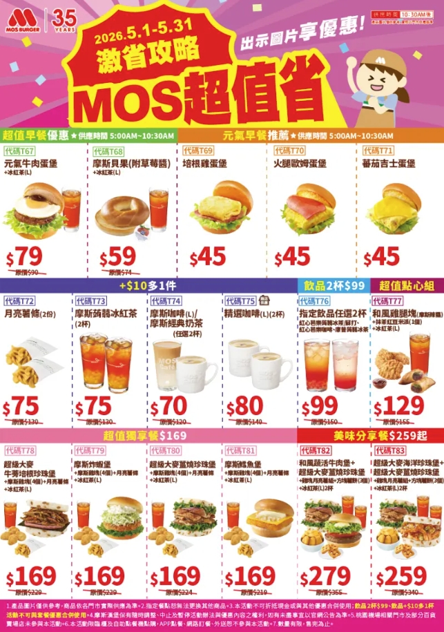 - 月亮薯條、摩斯蒟蒻冰紅茶、摩斯咖啡/摩斯奶茶、精選咖啡+10元多一件