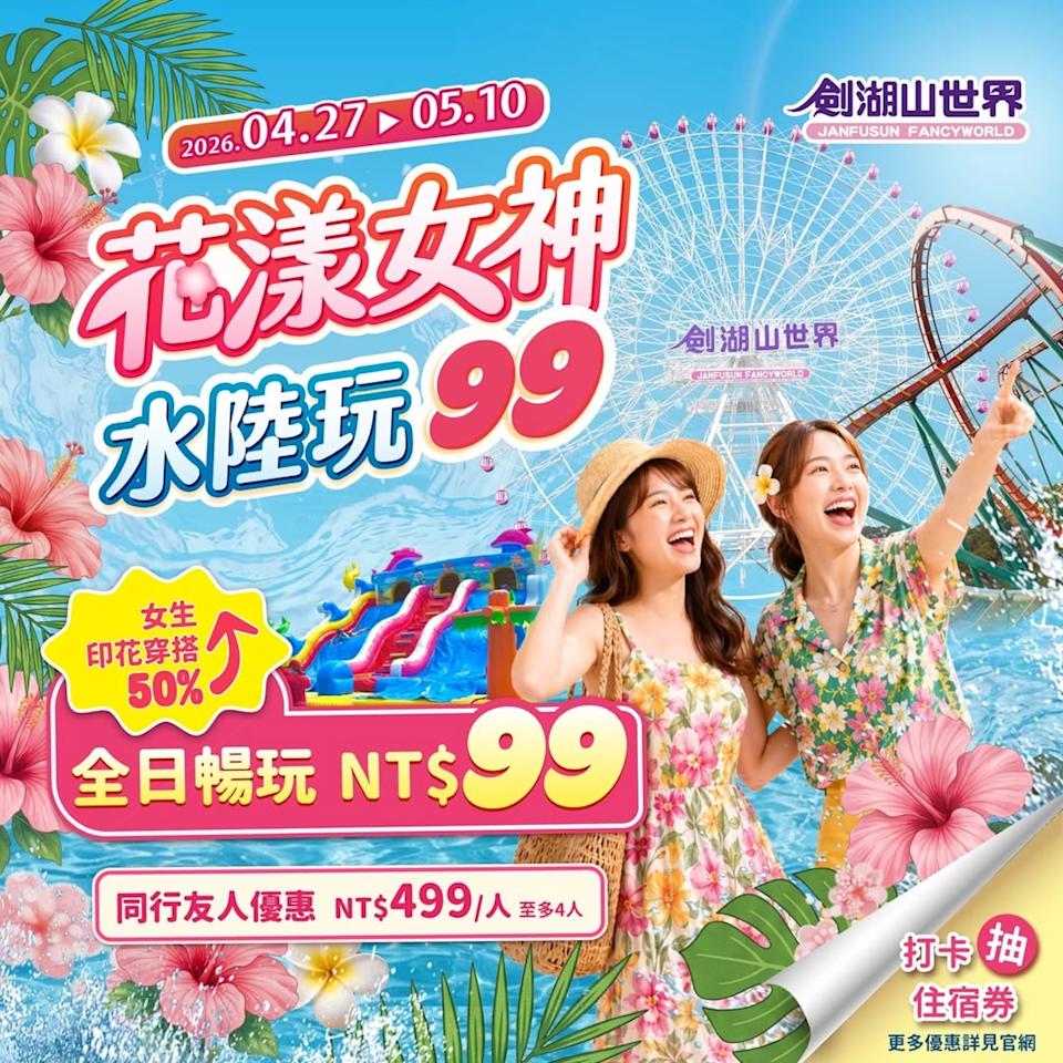 - 女生限定,全身50%以上連續印花穿著,全日暢玩只要99元;同行友人每人499元,最多4人。