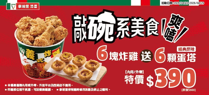- 狂省八塊雞桶餐59折(咔啦脆雞x8+原味蛋撻x6):優惠代碼50465 $499