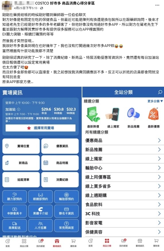 一名好市多會員在「COSTCO 好市多 商品消費心得分享區」臉書社團分享,在藥房結帳時意外聽到藥師在跟一位老先生聊天,老先生好像有固定吃的保健食品,但沒有用過好市多APP,藥師幫老先生下載並跟解釋,「其實好市多有提供很多服務可以在APP裡面預約」,像是聽力測驗、眼鏡訂購預約等。