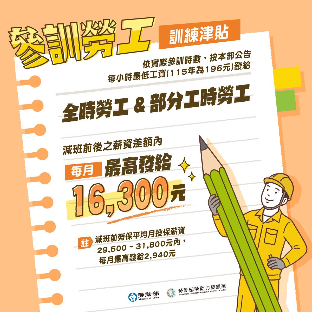 凡符合資格的勞工,不分產業、年齡或性別,皆可於減班期間參加勞動力發展署所屬各分署自辦及委辦的在職訓練課程,或由各分署安排參加勞動力發展署建置的勞動力發展數位服務平台所提供的各類數位課程,在減班前後薪資差額範圍內,依實際參訓時數核發訓練津貼,每月最高補助16,300元。