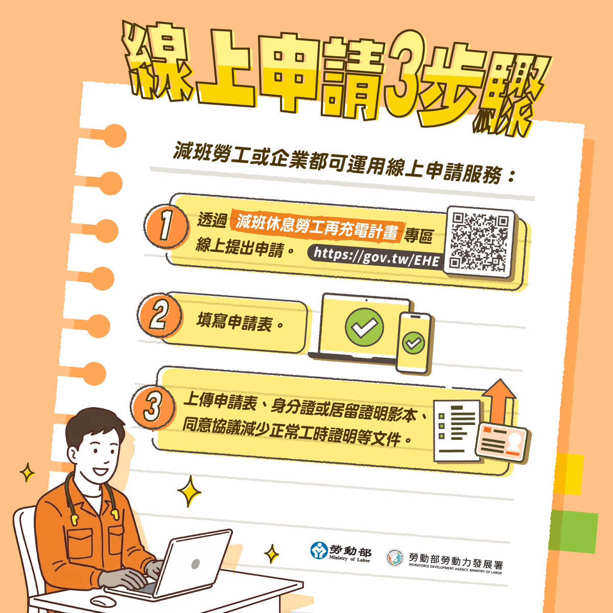 為提升申辦便利性,勞動力發展署提供再充電計畫線上申請服務,簡單3步驟即可完成: