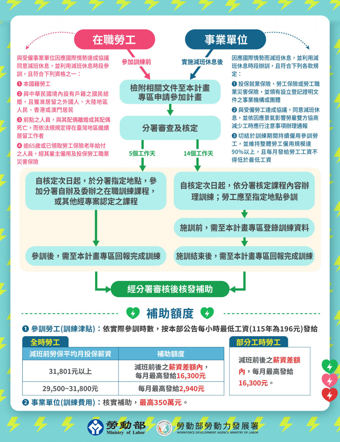 企業端方面,若在減班休息時段辦理員工在職訓練,並維持整體員工僱用規模達90%以上,可核實申請辦訓費用補助,最高350萬元,不僅有助於穩定勞雇關係,更能強化人力素質、提升整體營運發展能力。