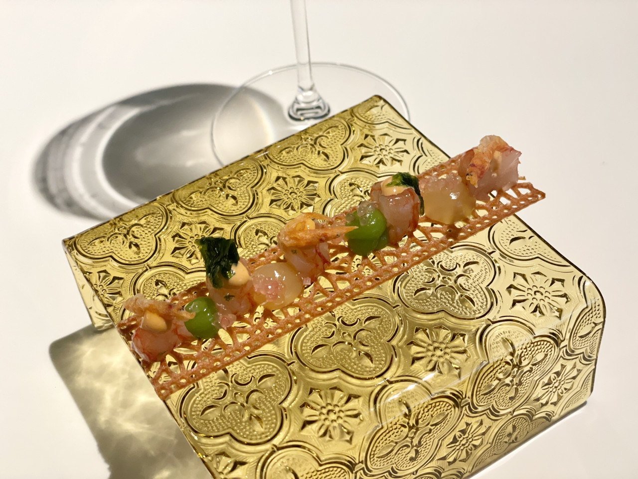 他選用來自桃園大溪的胭脂蝦、蝦殼製成的濃郁乳化醬,搭配海藻油和薑凝膠,再點綴拇指檸檬帶出清新酸香,做出一道向西班牙加地斯(Cádiz)的經典 Tortilla de Camarones 致敬的料理。