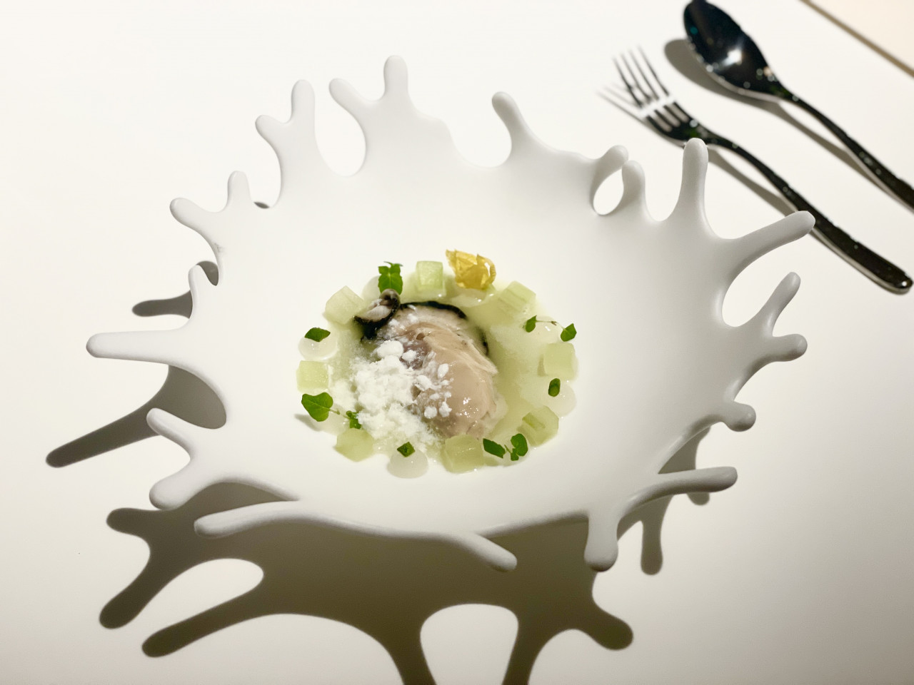 Guillardeu No. 2 生蠔則搭配冰鎮過的哈密瓜、小黃瓜、薄荷湯品,藉以捕捉安達盧西亞(Andalucía)盛夏冷湯的精髓。最後撒上一層以發酵乳製成的克菲爾粉,堆疊清新的層次感。而包含無花果在內的十多種當季蔬菜,佐以西班牙伊比利火腿奶油醬,也成為口感、風味都令人喜愛的料理。