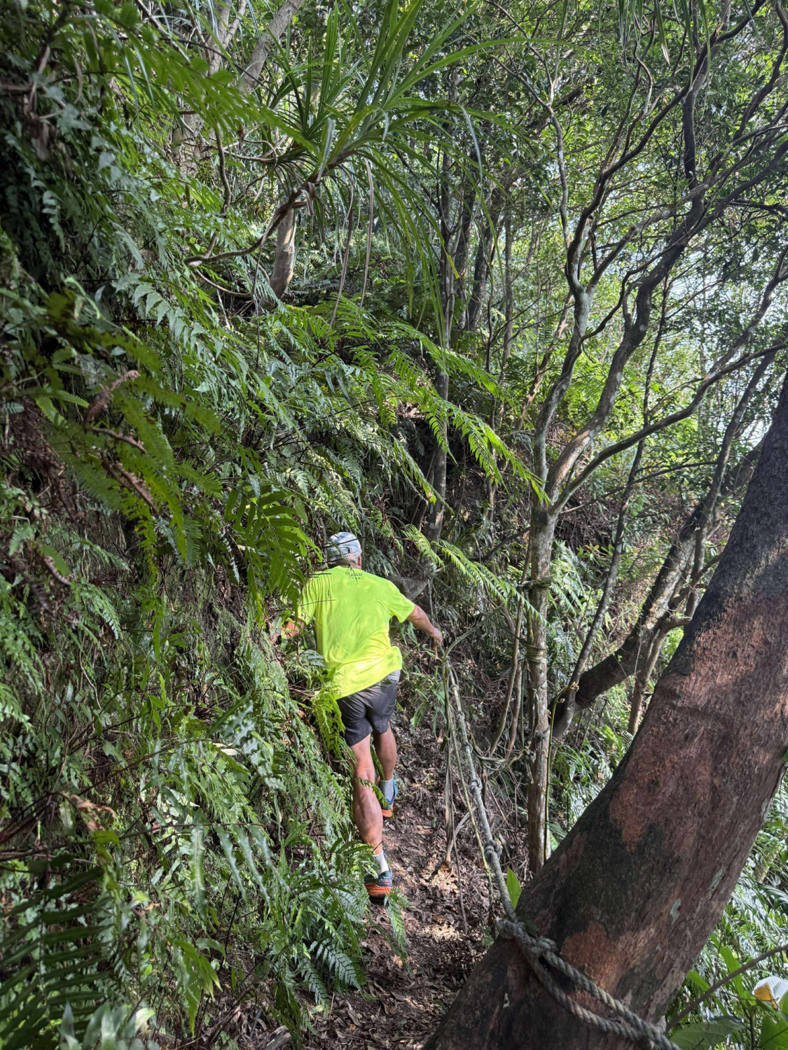 上半段的路比較平緩,下半段回來充滿挑戰,這段長的路是經過千年鐘乳石洞後拉繩子直上下坡山,可別小看這個海拔不到200米的小山,我們經過盤根錯節的大樹,再拉繩上山,這條山徑沒有什麼踩點,必須靠兩手抓繩,靠手的力量挺上去!