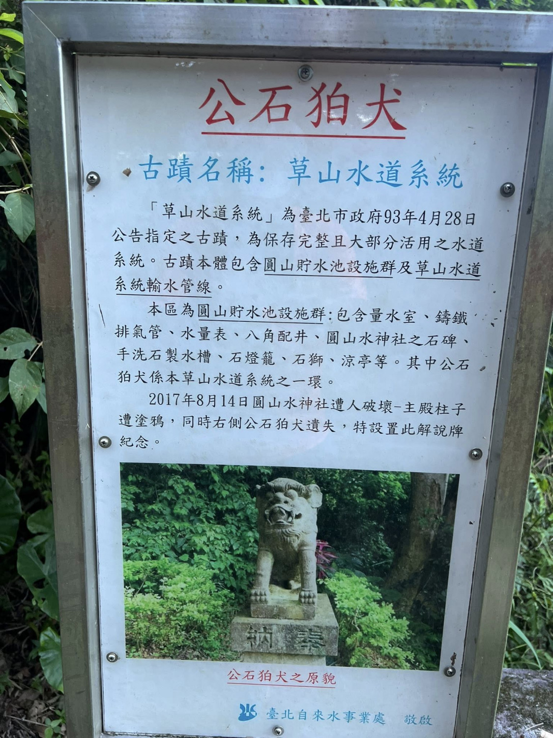 這個地方是有典故的,日治時代,隨著台北居住人口增多,在昭和時代動員很多人力開挖草山水道系統,因為工程艱鉅造成很多人傷亡,日本人在這裡造神社。下面一層除了有貯水池,還有石燈籠,手水缽,再往上是公石伯犬,這尊石雕連同神社在2017年遭到破壞,石犬雕塑被偷走。原來這裡攸關的是圓山飯店的飲水系統。