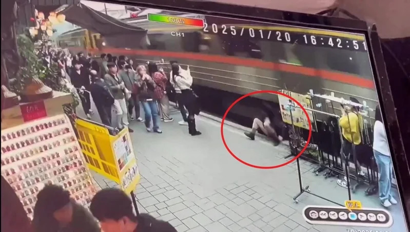新北市平溪區十分火車站附近有名菲律賓籍女遊客(紅圈處),想拍攝與即將經過的列車同框照片,張開雙臂時遭列車碰撞,倒到地受傷。聯合報記者邱瑞杰/翻攝