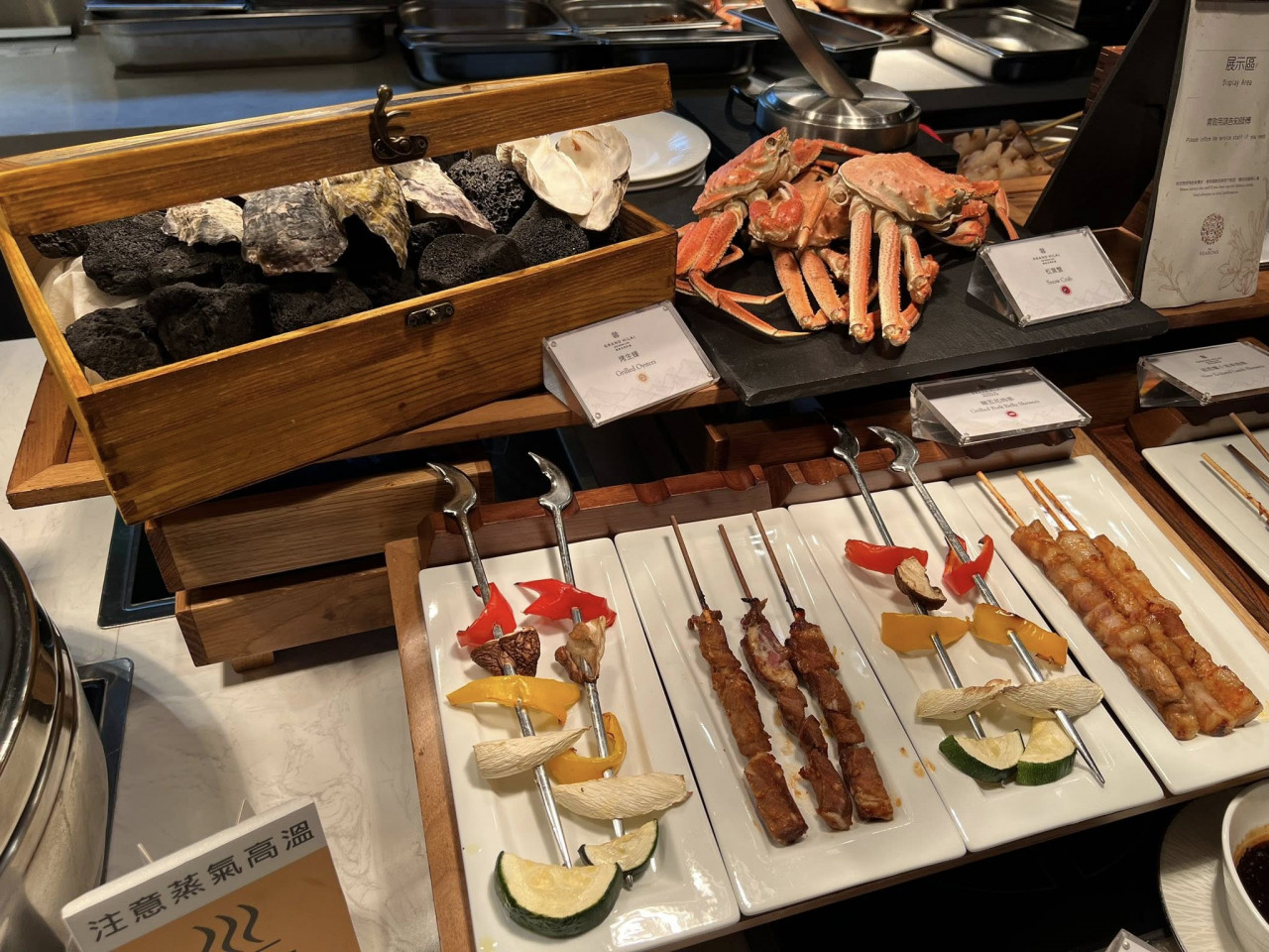 後排的燒烤區,樣式也很多,現場服務人員非常親切,所有的燒烤都是現做。旁邊的生魚片,像鮭魚,旗魚,扇貝,小管,看起來都是精挑細選過,口感和一般飯店的自助餐很不一樣。再到水果專區,看起來也是品質保證。