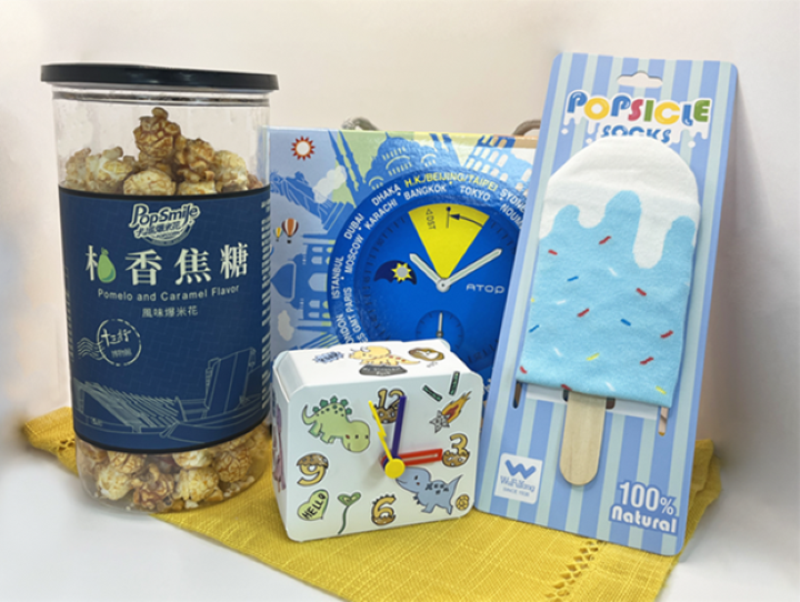 新北觀光工廠主題禮包共規劃兩款主題,每款精選3家新北觀光工廠特色產品,分別為適合親子家庭的「童趣探險包」,內含卡滋爆米花觀光工廠樂園的柚香焦糖爆米花、王鼎時間科藝體驗館的時鐘DIY材料包及吳福洋襪子故事館的冰棒造型短襪。讓民眾一次體驗零食、手作與趣味小物的歡樂組合。