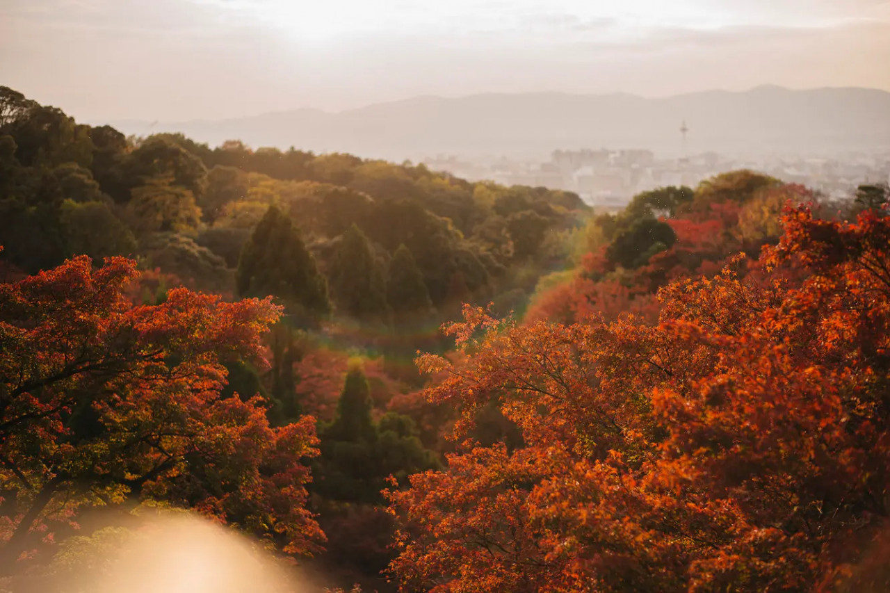 清水寺周邊種植了多達千棵的山楓,從懸空的清水舞台上俯瞰周圍染紅的楓葉,更有一種古韻的禪意之美。入夜之後,點燈的清水舞台照映出楓葉的橘紅色澤,站在高處還同時可以將市區夜景也收入眼底。