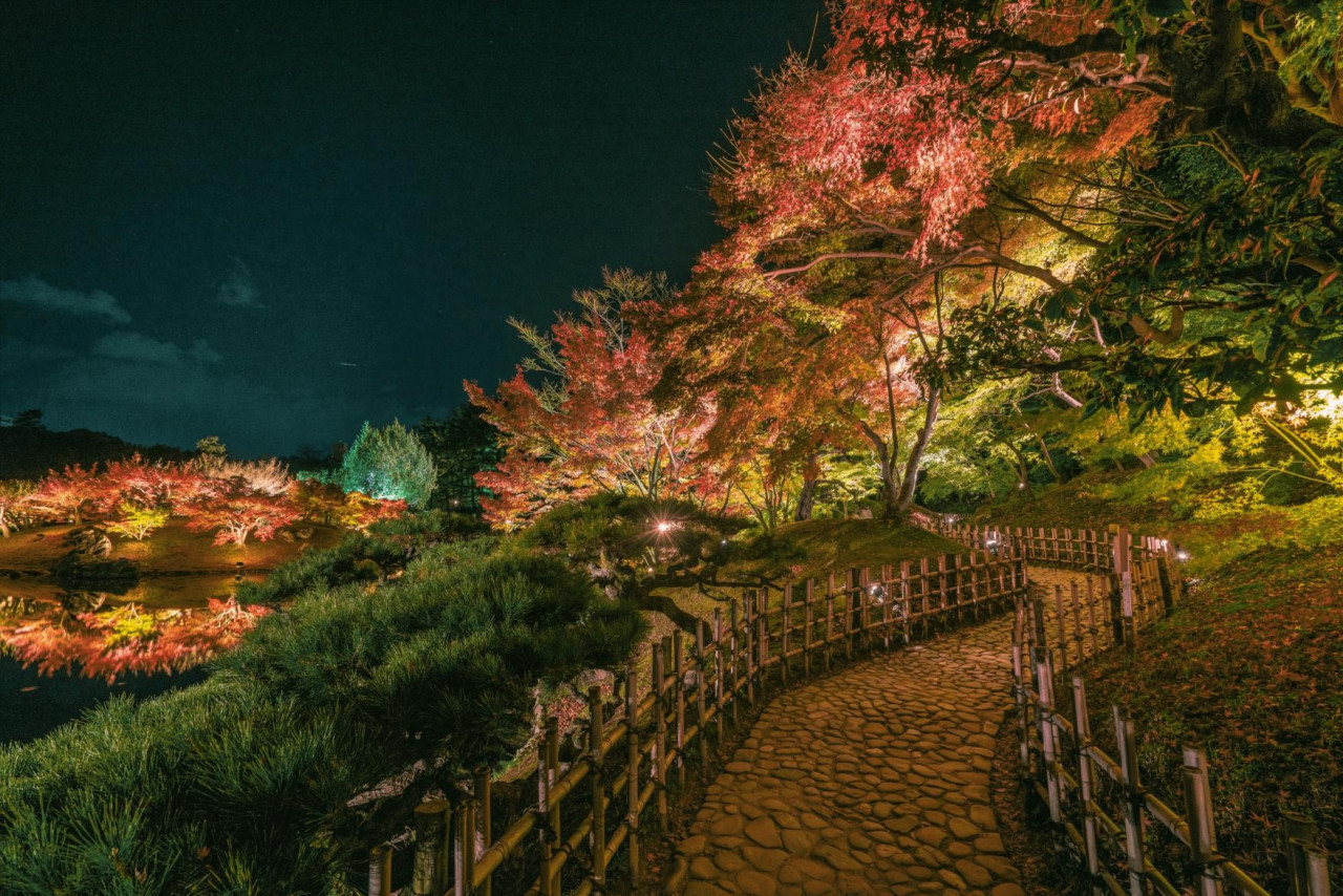 位在香川縣高松市的栗林公園曾在米其林觀光指南中被評為三星景點,偌大的公園內有著江湖時代的日式庭園造景,小橋流水與涼亭的庭園景觀,詩情畫意的景色散發出古色古香的情調與韻味。秋季時,艷紅的楓葉與庭園景觀相輔相成,夜晚點燈後的景色更備受遊客喜愛與推崇。