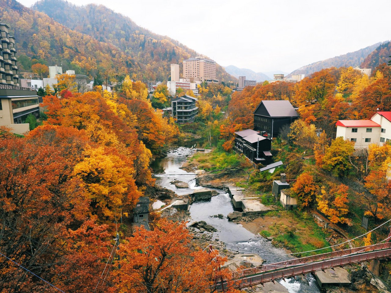 位在札幌近郊的定山溪是北海道著名的溫泉鄉,入秋之後山巒的楓樹被染成黃、橘、紅的漸層色彩,層層遞進的自然景觀與被大自然環抱的美景,交織成絕美的賞楓景點。其中,二見吊橋、白糸瀑布、月見橋...都是定山溪周邊推薦的楓葉景點。