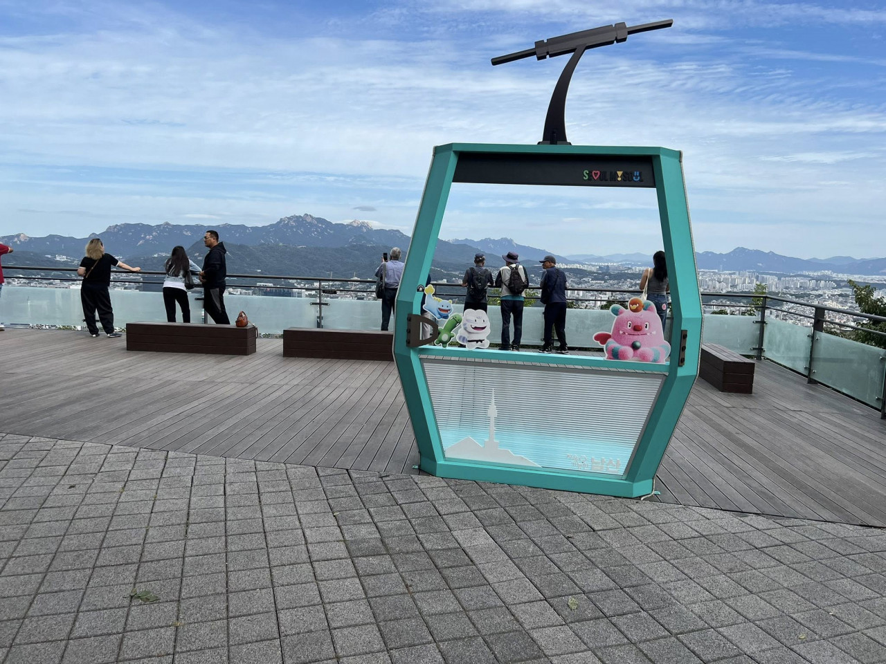 等到大家一起集合,改成坐纜車上首爾塔,這回終於有充足時間看看四週的風景,這個塔原是廣播電視塔,後來成為熱門景點,年輕男女約會的地方,很多愛情鎖鏈串成漂亮的裝飾,著名的「來自星星的你」等劇集都在這裡拍攝。