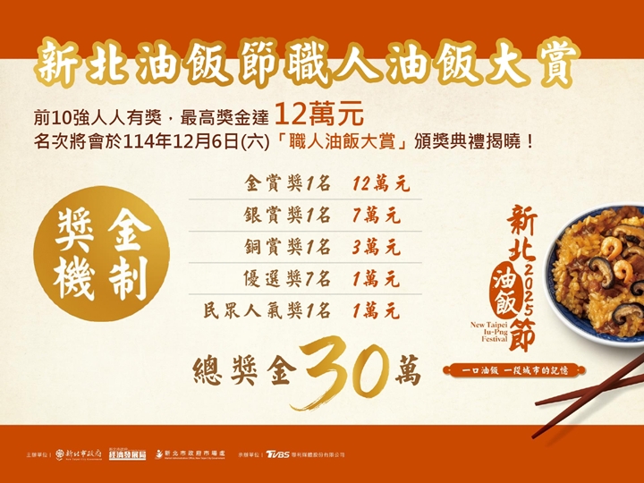市場處補充,「新北油飯節」店家報名期間自即日起至114年10月17日止,後續還有民眾票選、市集等活動,本次活動獎項分為「金賞」12萬元1名、「銀賞」7萬元1名、「銅賞」3萬元1名及「優選」1萬元7名,誠摯邀請各市場、攤集場(區)攤商及商圈店家,以及所有熱愛油飯的市民朋友共襄盛舉,一同參與這場屬於新北的庶民美食饗宴,一起傳遞這段關於家庭、努力與城市的記憶,讓庶民美食不只是味蕾的享受,更成為帶動地方經濟與文化觀光的推手。