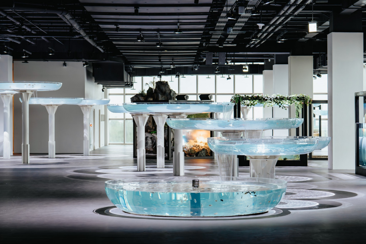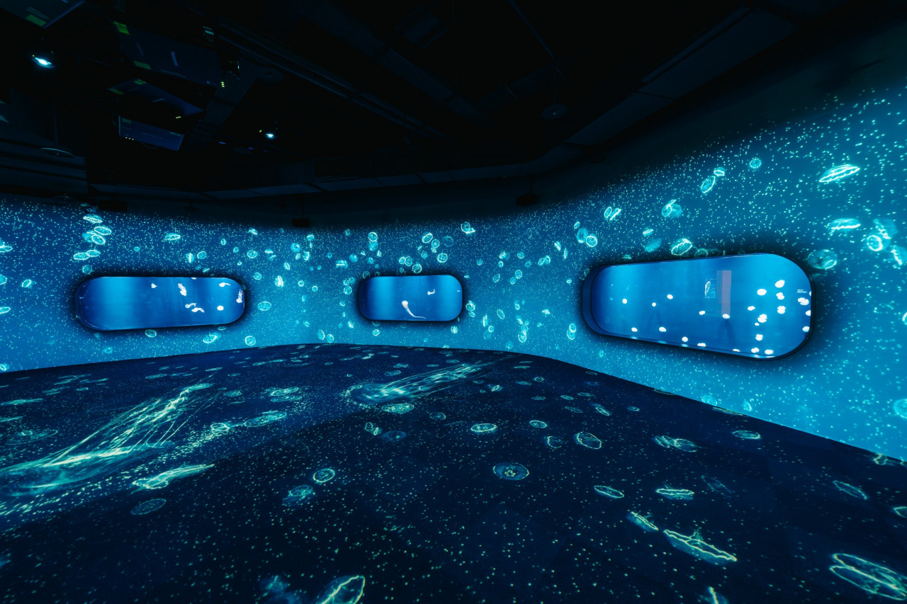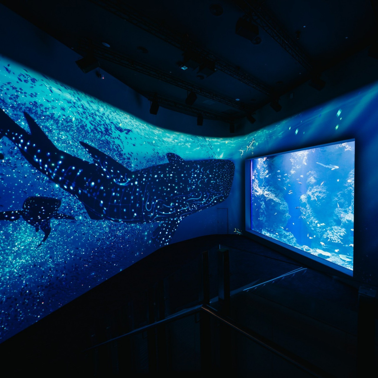 台中海洋館打破過去對於傳統水族缸的展示,主打結合電子投影技術與光影變幻的沉浸式體驗,並結合在地台中河川特色與流域介紹,從在地水生生態望向世界海洋多元生態。