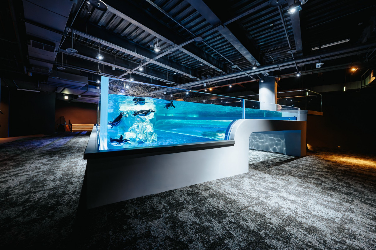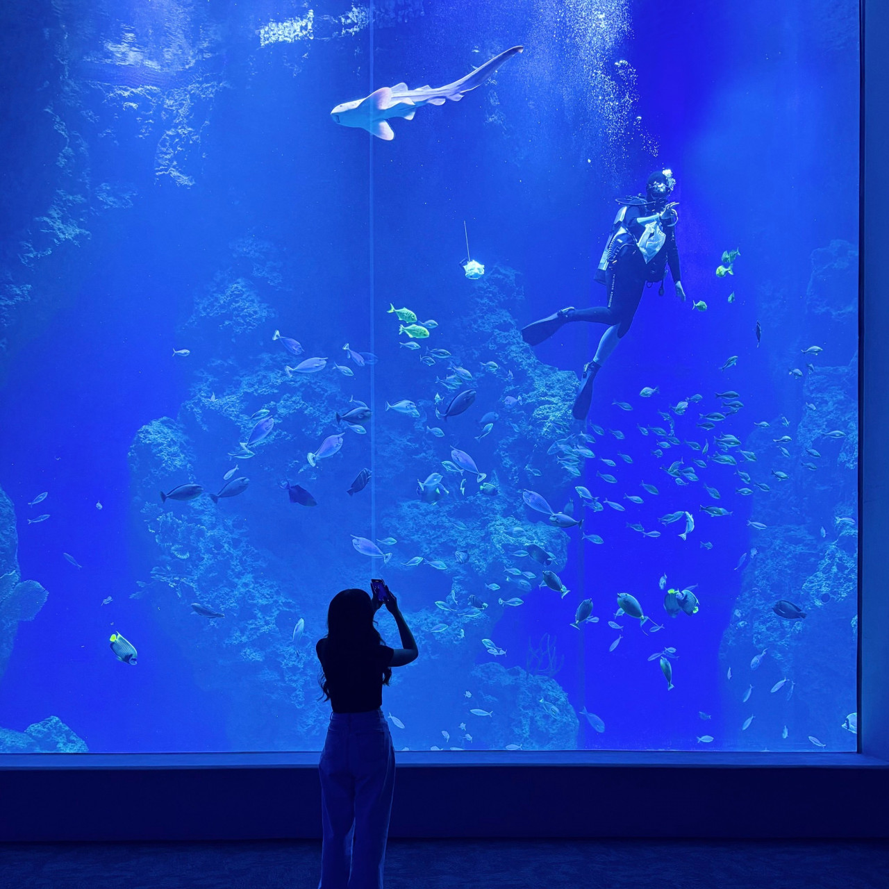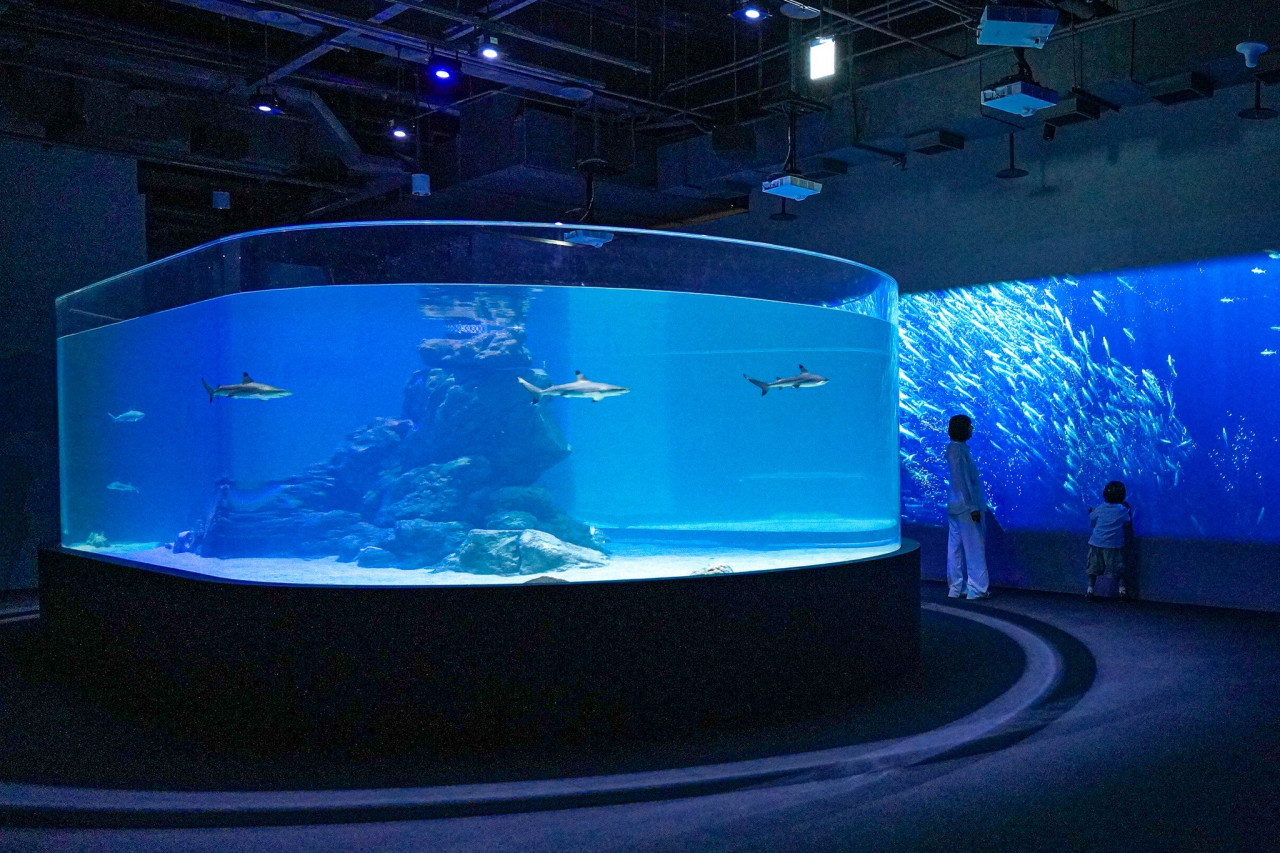 台中海洋館打造獨一無二的沉浸式鯊魚展示空間,以360度全透明的無邊際感結合互動投影技術,營造出宛如「與鯊魚共游」的震撼體驗,讓遊客可以漫步並穿梭於水缸之間。