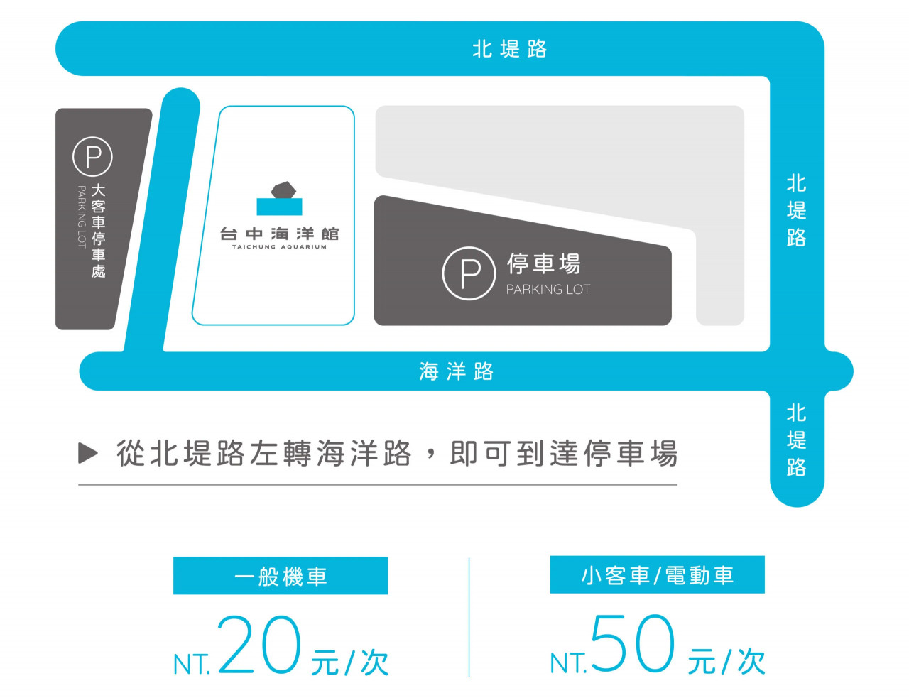 - <北上>國道3號【沙鹿系統交流道】→ 台10線中清路9段 → 右轉臨海路 → 左轉北堤路 →左轉海洋路 → 抵達台中海洋館