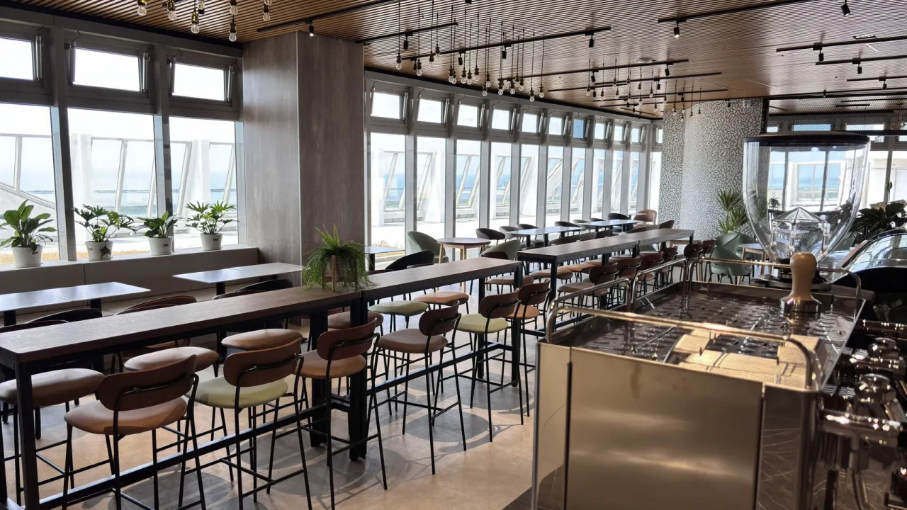 位在台中海洋館頂樓的景觀咖啡廳擁有三面落地窗的良好視野,不僅採光明亮,還能夠一邊享受陽光從玻璃窗邊中灑落的美景,一邊品嘗咖啡飲品。咖啡廳外的戶外觀景台能夠飽覽台中港區及湛藍的海岸美景,非常適合打卡拍照。