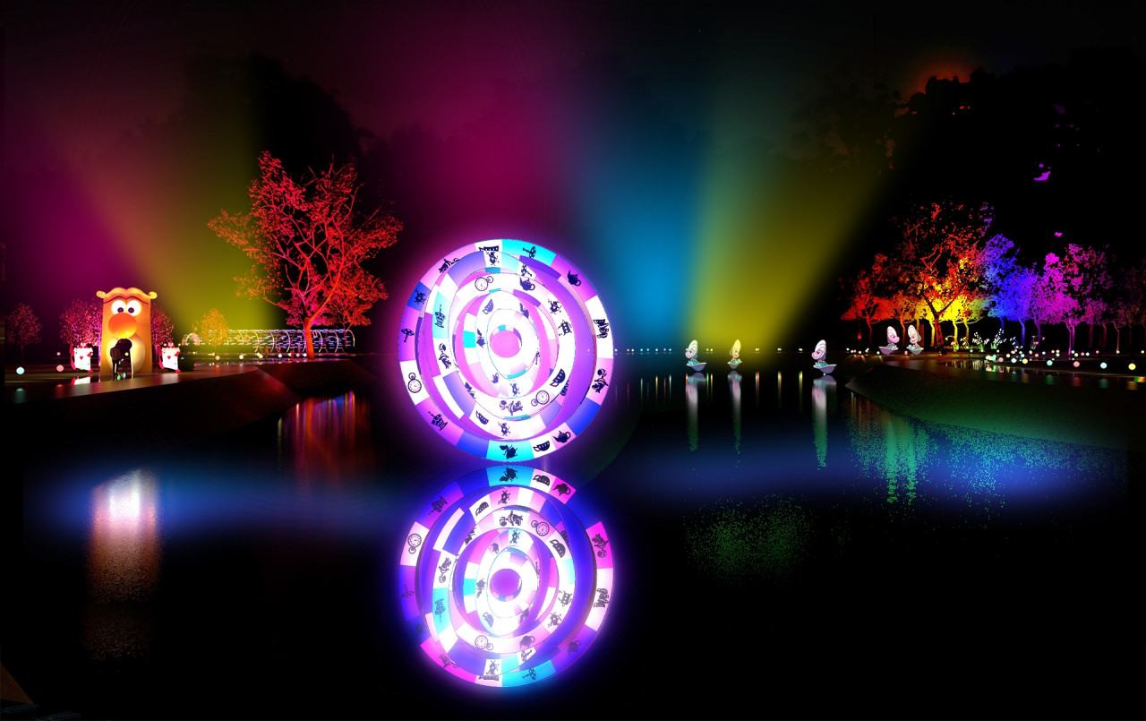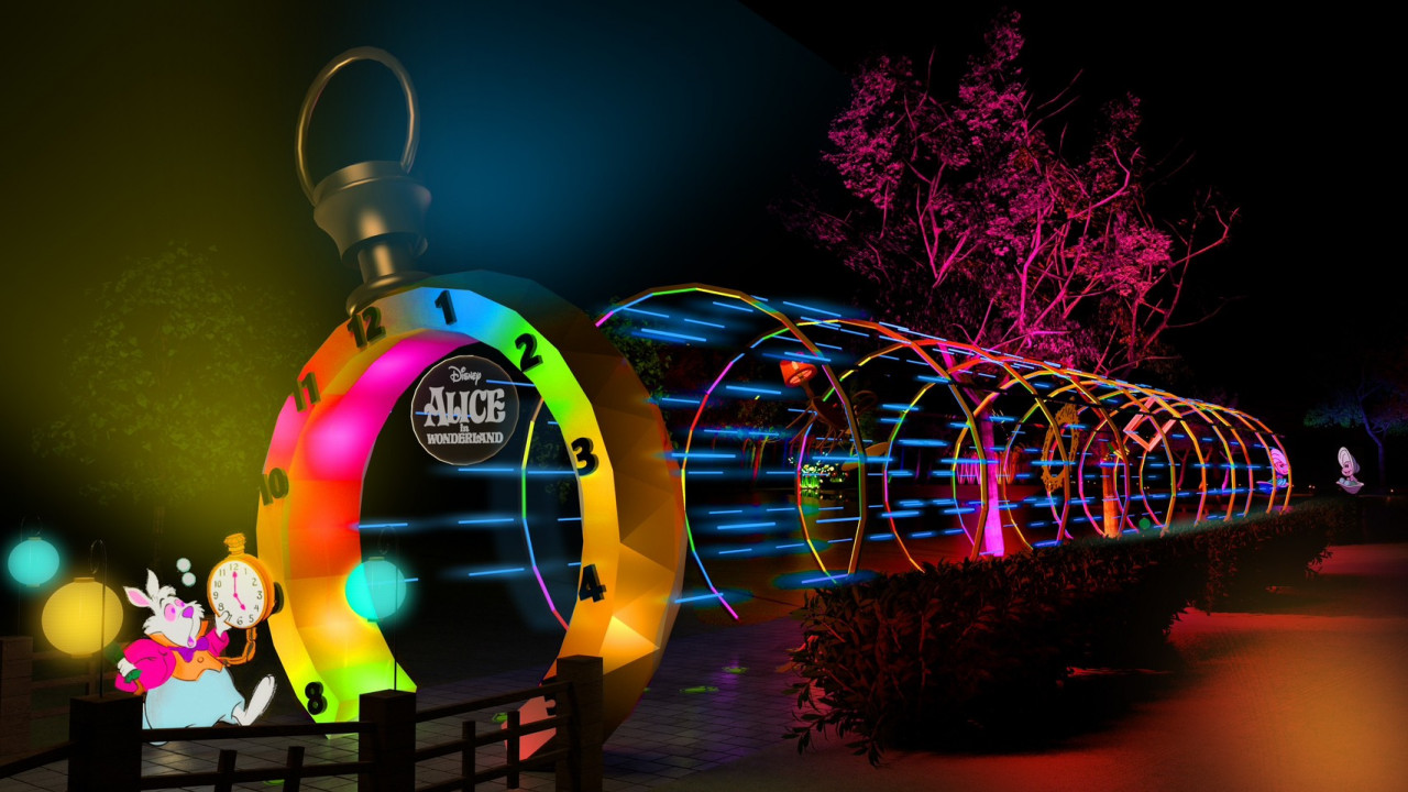 這場由國際級華裔設計師Daniel Wong(黃偉豪)策展的光影藝術展,將《愛麗絲夢遊仙境》的敘事結構完整地移植到北香湖的地景中,規劃出八大主題展區,引導觀眾從現實走入奇幻。從長達30公尺的沉浸式光環隧道「追光的起點」,代表故事開端,引領愛麗絲墜入奇境的兔子與牠永不離身的懷錶。當遊客跟隨地面的兔子腳印穿過隧道,時空隨之轉化,一場光影夢境開始遍地開展。